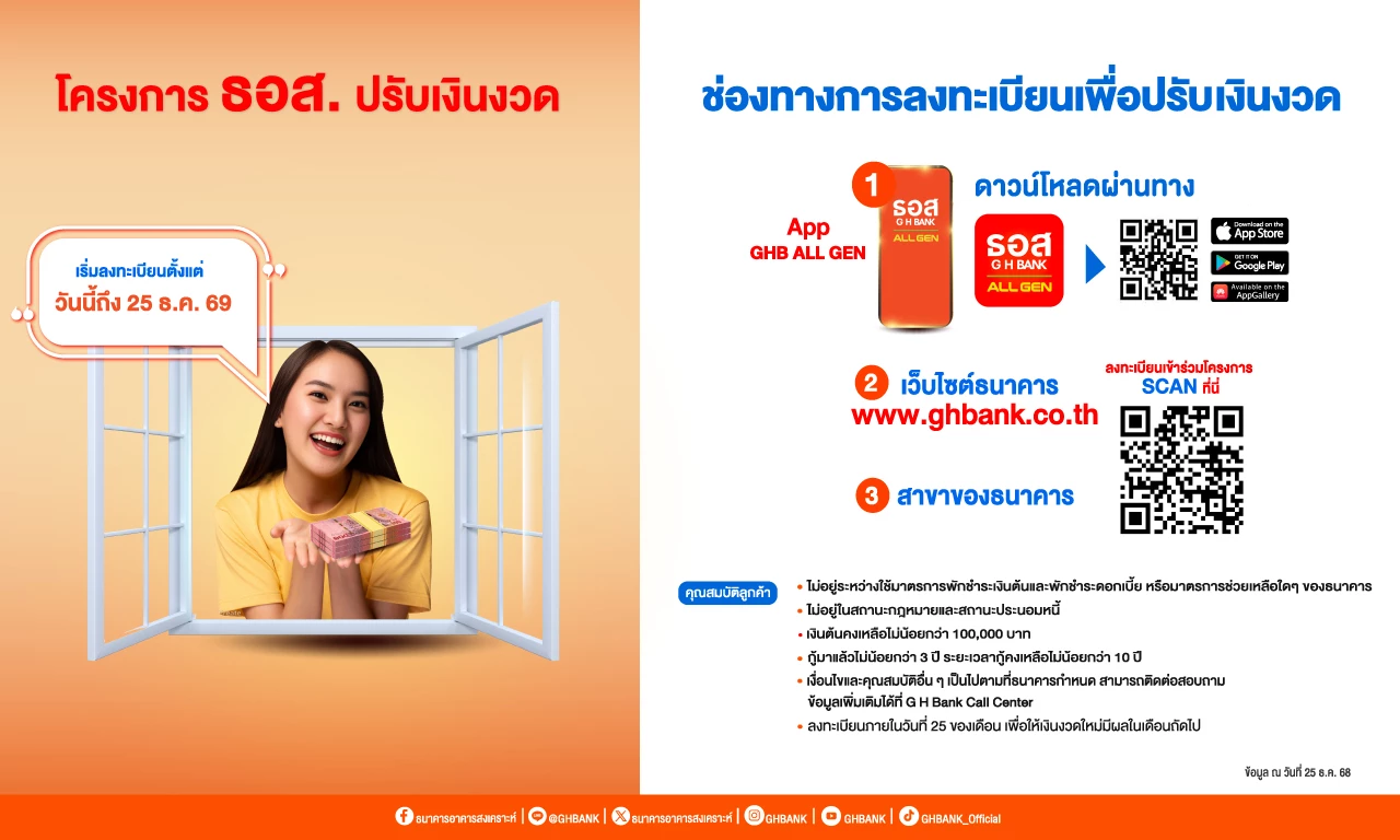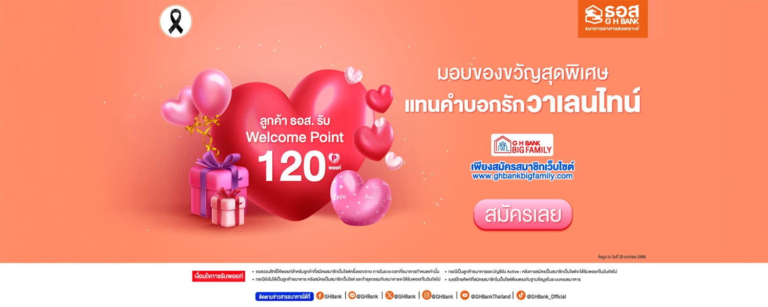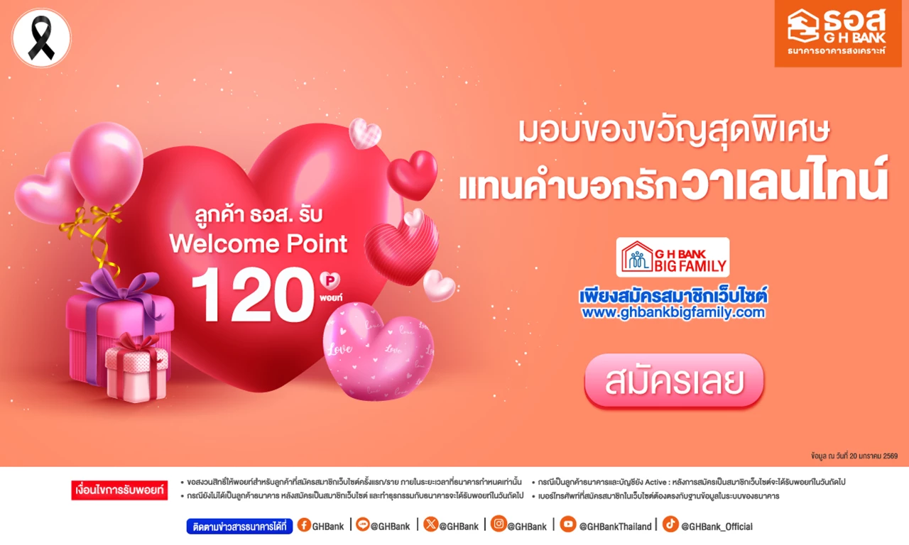 วาเลนไทน์นี้ให้บ้านเป็นของขวัญ! ธอส. จัดมหกรรม GHB ALL HOME EXPO 2026 ลดสูงสุด 50% ราคาเริ่มต้นเพียง 2.3 แสนบาท พร้อมโปรสินเชื่อดอกเบี้ย 0% ต่อปี พบกันวันที่ 13 - 15 กุมภาพันธ์ 2569 ณ ฟิวเจอร์พาร์ค รังสิต