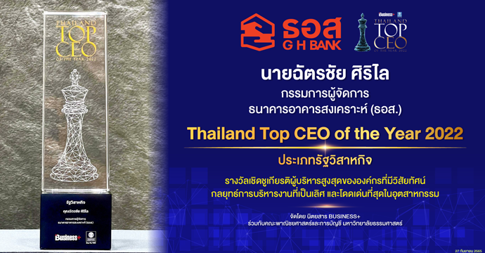 นายฉัตรชัย ศิริไล กรรมการผู้จัดการ ธนาคารอาคารสงเคราะห์ (ธอส.) รับรางวัล Thailand Top CEO of the Year 2022 ประเภทรัฐวิสาหกิจ ซึ่งนิตยสาร BUSINESS+ โดย บริษัท เออาร์ไอพี จำกัด (มหาชน) ร่วมกับคณะพาณิชยศาสตร์และการบัญชี มหาวิทยาลัยธรรมศาสตร์ จัดงานมอบรางวัลดังกล่าวขึ้นเพื่อยกย่องและเชิดชูเกียรติผู้บริหารสูงสุดขององค์กร ที่มีวิสัยทัศน์ มีกลยุทธ์ธุรกิจการบริหารงานที่เป็นเลิศและโดดเด่นที่สุดในแต่ละอุตสาหกรรม สามารถเป็นแรงบันดาลใจให้แก่ผู้บริหารรุ่นใหม่ โดยมีเกณฑ์การพิจารณารางวัล พิจารณาทั้งกลยุทธ์ทางธุรกิจ เพื่อการเติบโตอย่างยั่งยืน ทักษะการบริหารที่เป็นเลิศ ผลประกอบการขององค์กร นวัตกรรมที่นำไปสู่ความเปลี่ยนแปลงของอุตสาหกรรม สร้างคุณค่าให้แก่ลูกค้า และสร้างคุณค่าให้แก่ผู้ถือหุ้น ทั้งนี้ พิธีประกาศรางวัลดังกล่าวจัดขึ้น ณ ห้องแกรนด์บอลรูม โรงแรมแกรนด์ ไฮแอท เอราวัณ กรุงเทพฯ