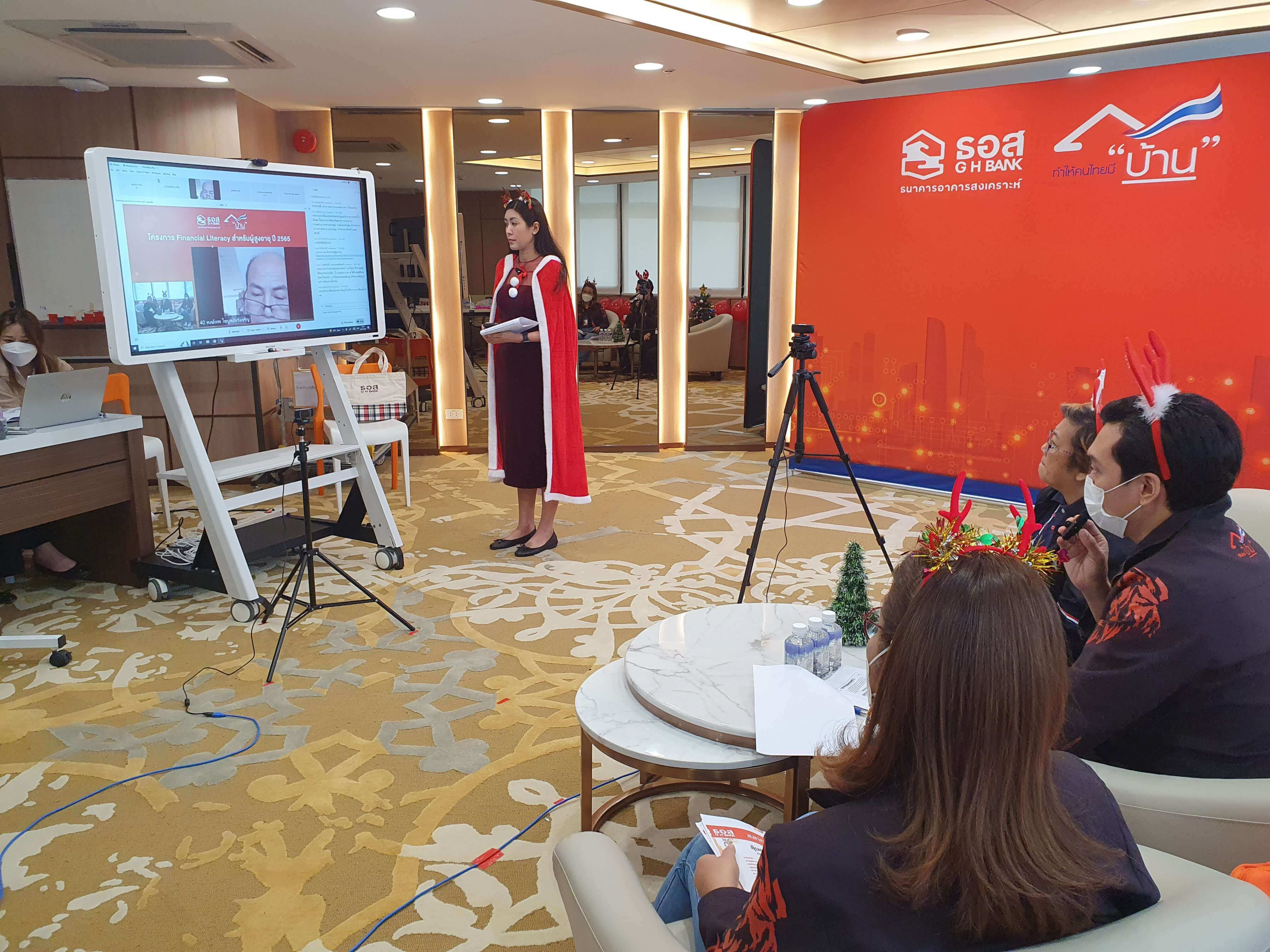 เมื่อวันศุกร์ที่ 23 ธันวาคม 2565 ฝ่ายนโยบายสินเชื่อธุรกิจและภาครัฐ และฝ่ายสนับสนุนสาขานครหลวง ได้จัดกิจกรรม “โครงการ Financial Literacy สำหรับผู้สูงอายุ” ปี 2565 ครั้งที่ 2 ร่วมกับข้าราชการ และลูกจ้างของส่วนราชการที่เกษียณอายุราชการ ในสังกัดสำนักงานคณะกรรมการข้าราชการพลเรือน (กพ.) ในรูปแบบ Online รอบที่ 2 ณ ห้องสราญรมย์ ชั้น 3 อาคาร 2 ธนาคารอาคารสงเคราะห์ สำนักงานใหญ่ โดยมีวัตถุประสงค์เพื่อให้ความรู้ ความเข้าใจเกี่ยวกับสินเชื่อเพื่อที่อยู่อาศัย ในโครงการสินเชื่อเพื่อที่อยู่อาศัยสำหรับผู้สูงอายุ (Reverse Mortgage : RM) และผลิตภัณฑ์ต่าง ๆ ที่ธนาคารจัดทำขึ้นเพื่อผู้สูงอายุ และความรู้เกี่ยวกับการวางแผนทางการเงิน และการออมด้วยสลากออมทรัพย์ ธอส.