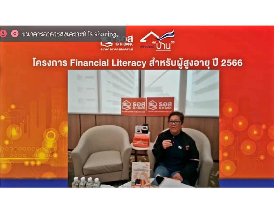 วันเสาร์ที่ 27 พฤษภาคม 2566 ฝ่ายนโยบายสินเชื่อธุรกิจและภาครัฐ ฝ่ายสนับสนุนสาขานครหลวง และฝ่ายกฎหมายได้จัดกิจกรรม “โครงการ Financial Literacy สำหรับผู้สูงอายุ” ปี 2566 ร่วมกับข้าราชการ และลูกจ้างของส่วนราชการ ในสังกัดสำนักงานคณะกรรมการข้าราชการพลเรือน (กพ.) และลูกค้าธนาคารอาคารสงเคราะห์ที่มีอายุตั้งแต่ 50 ปีขึ้นไป ในรูปแบบ Online ณ ห้องสราญรมย์ ชั้น 3 อาคาร 2 ธนาคารอาคารสงเคราะห์ สำนักงานใหญ่ โดยมีวัตถุประสงค์เพื่อให้ความรู้ ความเข้าใจเกี่ยวกับสินเชื่อเพื่อที่อยู่อาศัย ในโครงการสินเชื่อเพื่อที่อยู่อาศัยสำหรับผู้สูงอายุ (Reverse Mortgage : RM) และผลิตภัณฑ์ต่าง ๆ ที่ธนาคารจัดทำขึ้นเพื่อผู้สูงอายุ การออมด้วยสลากออมทรัพย์ ธอส. ความรู้เกี่ยวกับการวางแผนทางการเงิน การเริ่มต้นอาชีพใหม่หลังเกษียณ และอาชีพที่น่าสนใจสำหรับผู้สูงวัย และกฎหมายที่เกี่ยวข้องกับผู้สูงอายุ