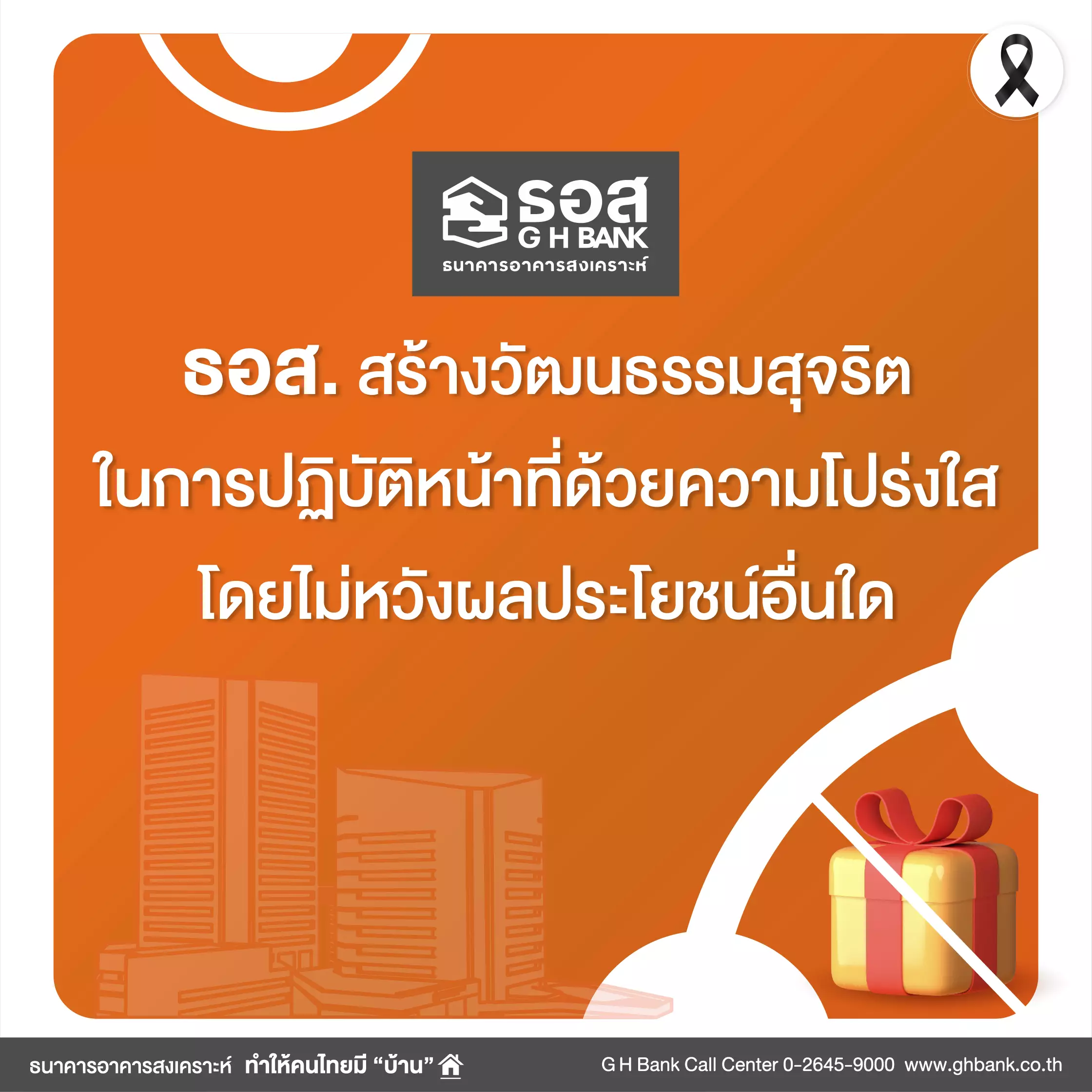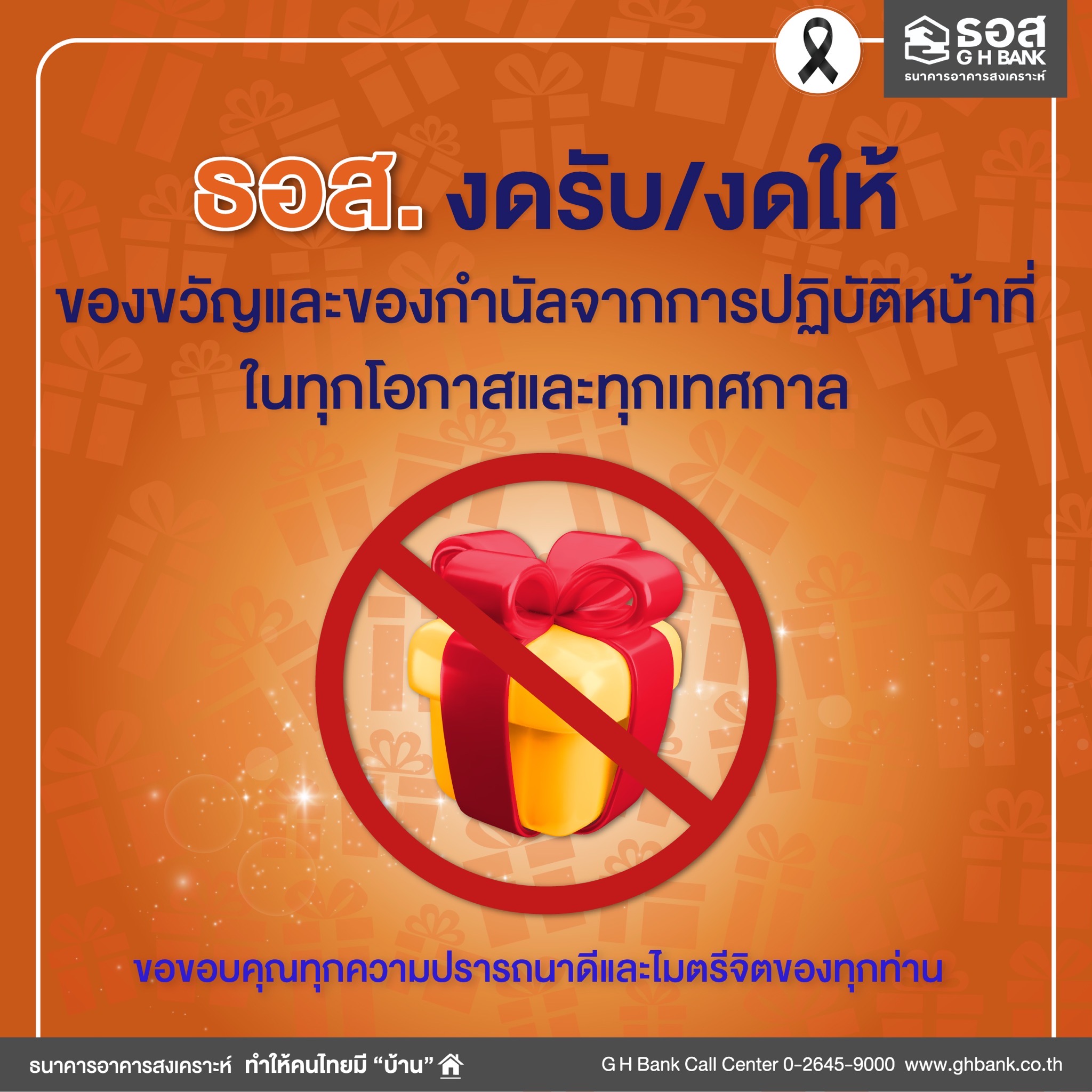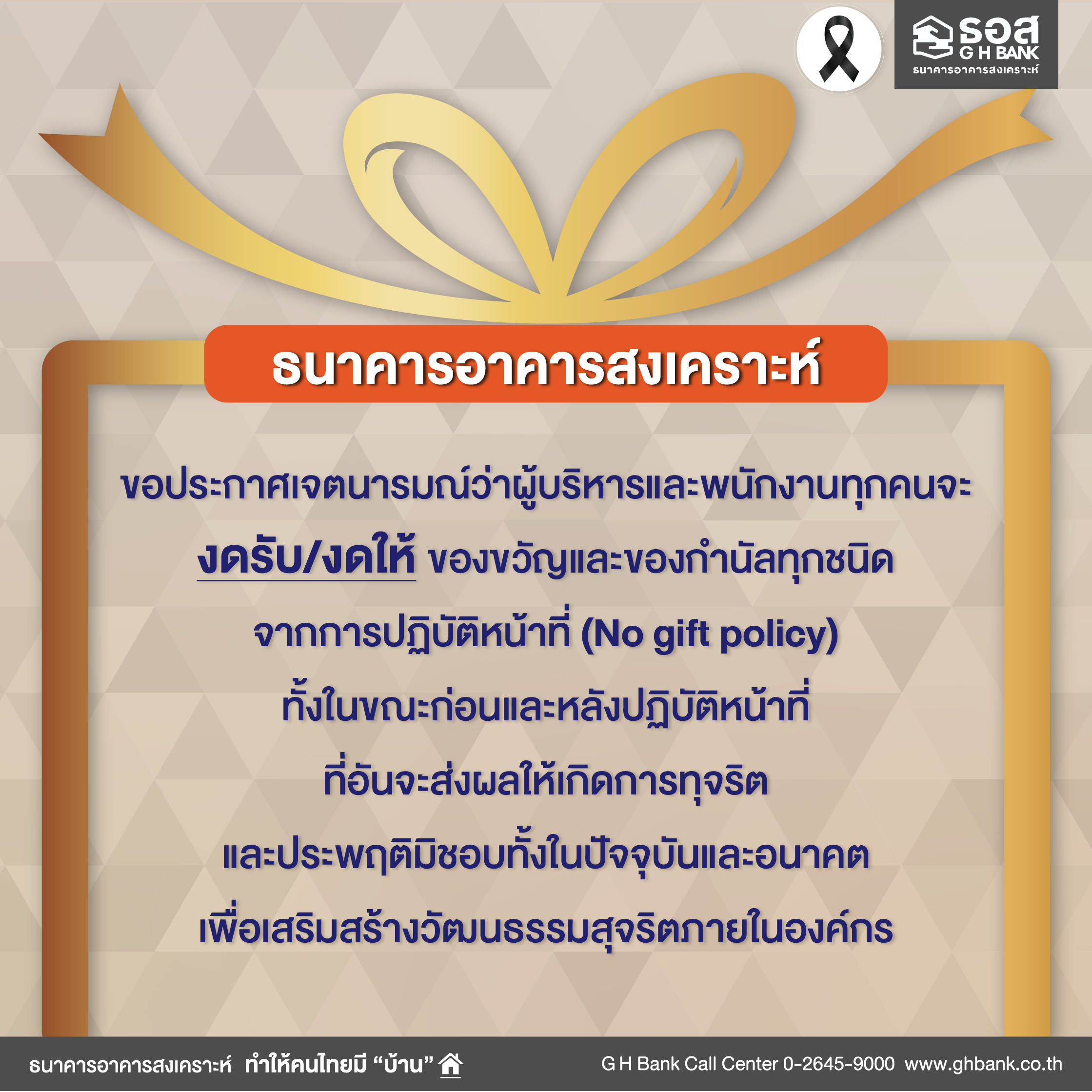 Download ประกาศธนาคารอาคารสงเคราะห์ เรื่อง นโยบายการไม่รับของขวัญและของกำนัลทุกชนิดจากการปฏิบัติหน้าที่ ( No Gift Policy) ประจำปี 2569 240.46 KB 11 กุมภาพันธ์ 2569 Download Announcement of Government Housing Bank : No Gift Policy 2026 261.25 KB 11 กุมภาพันธ์ 2569