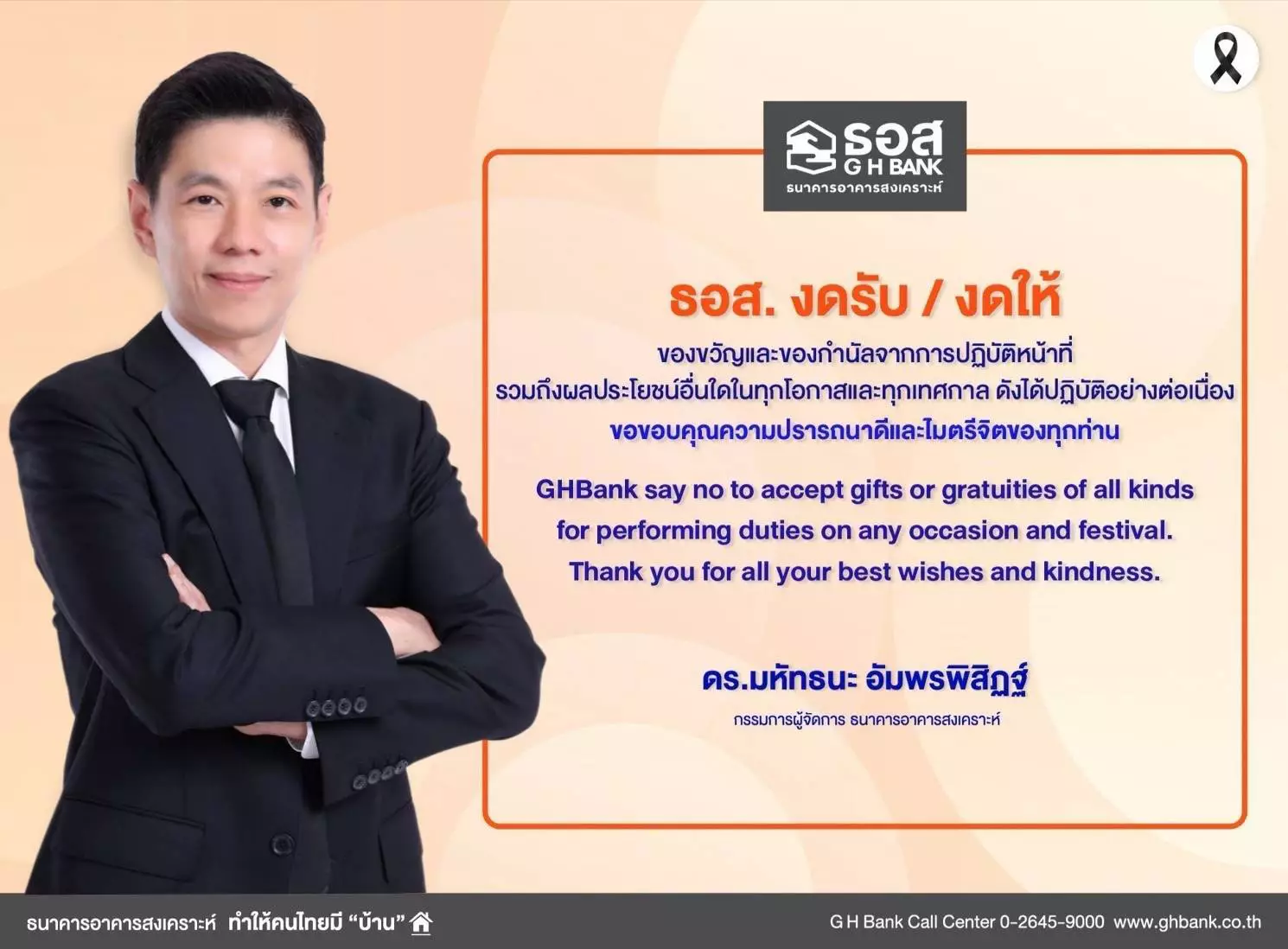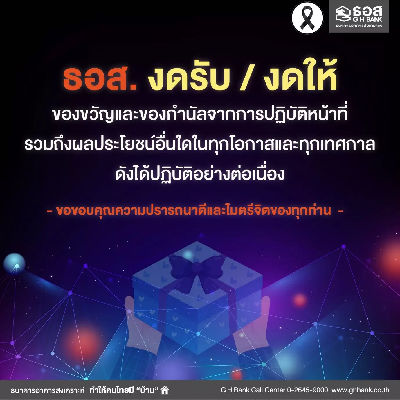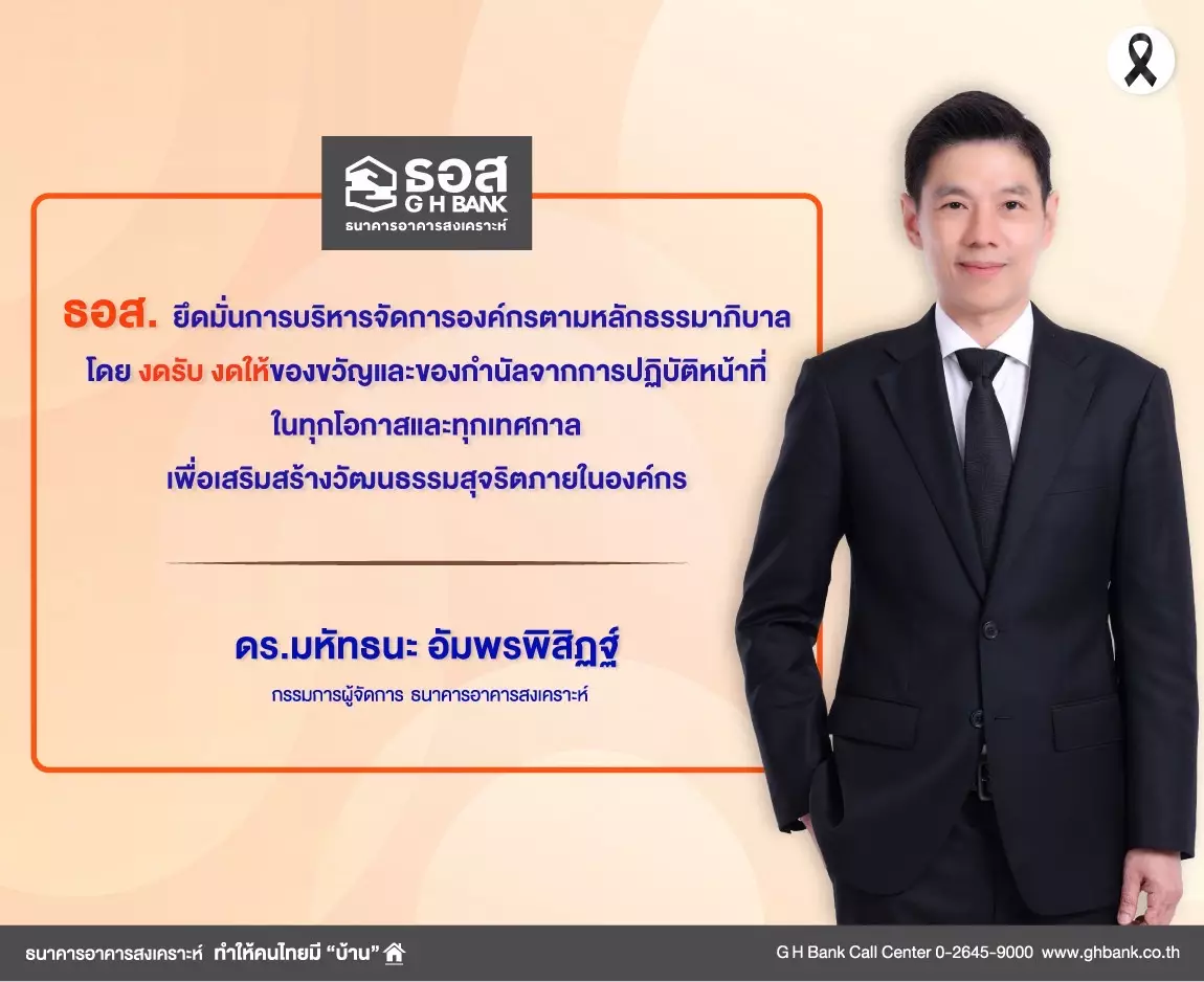 Download ประกาศธนาคารอาคารสงเคราะห์ เรื่อง นโยบายการไม่รับของขวัญและของกำนัลทุกชนิดจากการปฏิบัติหน้าที่ ( No Gift Policy) ประจำปี 2569 240.46 KB 11 กุมภาพันธ์ 2569 Download Announcement of Government Housing Bank : No Gift Policy 2026 261.25 KB 11 กุมภาพันธ์ 2569