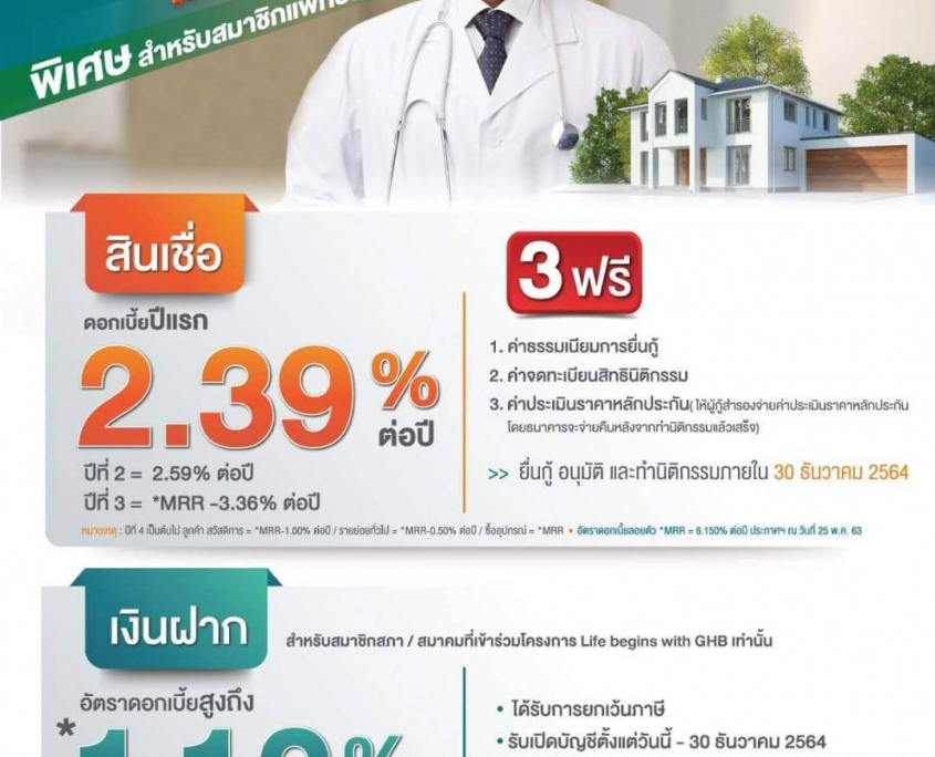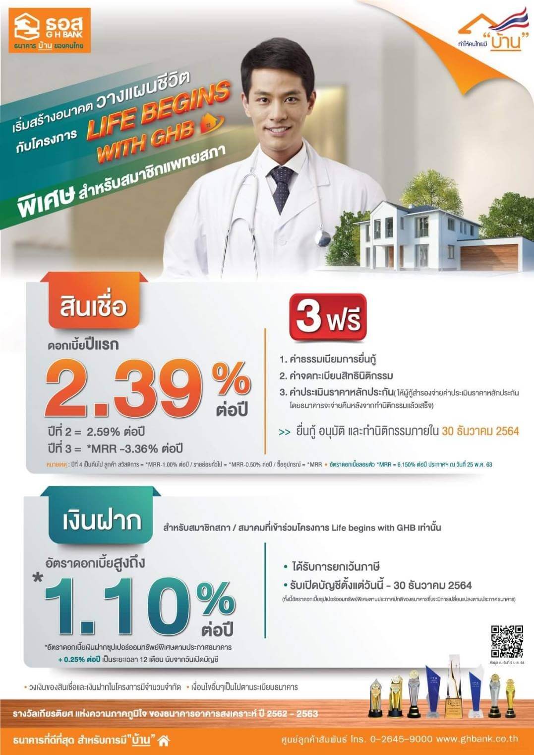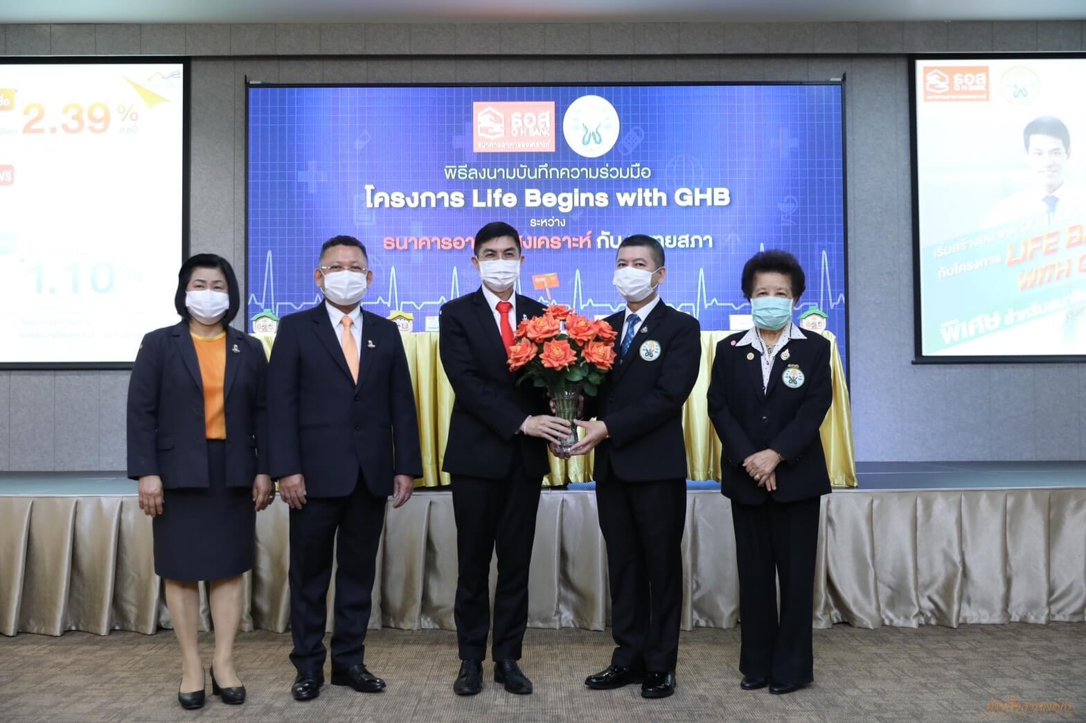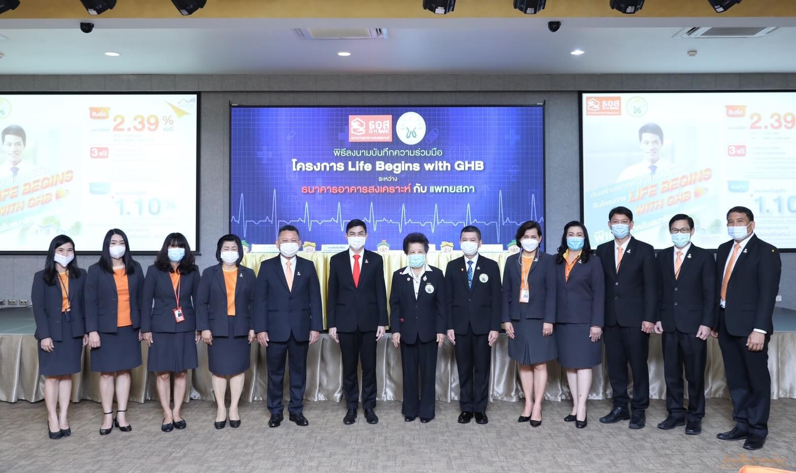 วันนี้ (8 กุมภาพันธ์ 2564) คุณฉัตรชัย ศิริไล กรรมการผู้จัดการ พร้อมด้วย ศาสตราจารย์เกียรติคุณ แพทย์หญิงสมศรี เผ่าสวัสดิ์ นายกแพทยสภา ร่วมลงนามบันทึกข้อตกลง (MOU) ความร่วมมือตามโครงการ Life Begins with GHB ระหว่างธนาคารอาคารสงเคราะห์ กับ แพทยสภา เพื่อส่งเสริมให้สมาชิกของแพทยสภากว่า 60,000 คนได้มีที่อยู่อาศัยเป็นของตนเองและมีการออมเงินเพื่อสร้างความมั่นคงกับผลิตภัณฑ์สินเชื่อและเงินฝากอัตราดอกเบี้ยพิเศษของธนาคาร โดยมีคุณวิทยา แสนภักดี รองกรรมการผู้จัดการ กลุ่มงานการตลาด คุณฉัตร์รวี จิรกุลเมธาพัฒน์ รองกรรมการผู้จัดการ กลุ่มงานสาขา พล.อ.ต.นพ.อิทธพร คณะเจริญ เลขาธิการแพทยสภา พร้อมด้วยคณะผู้บริหารระดับสูงของธนาคาร และสื่อมวลชน ร่วมในพิธี ทั้งนี้ พิธีลงนามความร่วมมือดังกล่าวจัดขึ้น ณ อาคารสภาวิชาชีพ ชั้น 14 กระทรวงสาธารณสุข จ.นนทบุรี