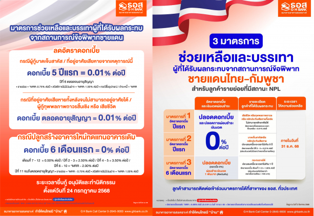 ธอส. เคียงข้างคนไทย ออกมาตรการช่วยเหลือลูกค้าประชาชนจากเหตุการณ์ความไม่สงบชายแดนไทย – กัมพูชา จัดทำ “มาตรการช่วยเหลือและบรรเทาความเดือดร้อนให้กับลูกค้าจากเหตุการณ์ชายแดน” และ “มาตรการช่วยเหลือและบรรเทาผู้ที่ได้รับผลกระทบจากสถานการณ์พิพาทชายแดนไทย – กัมพูชา”