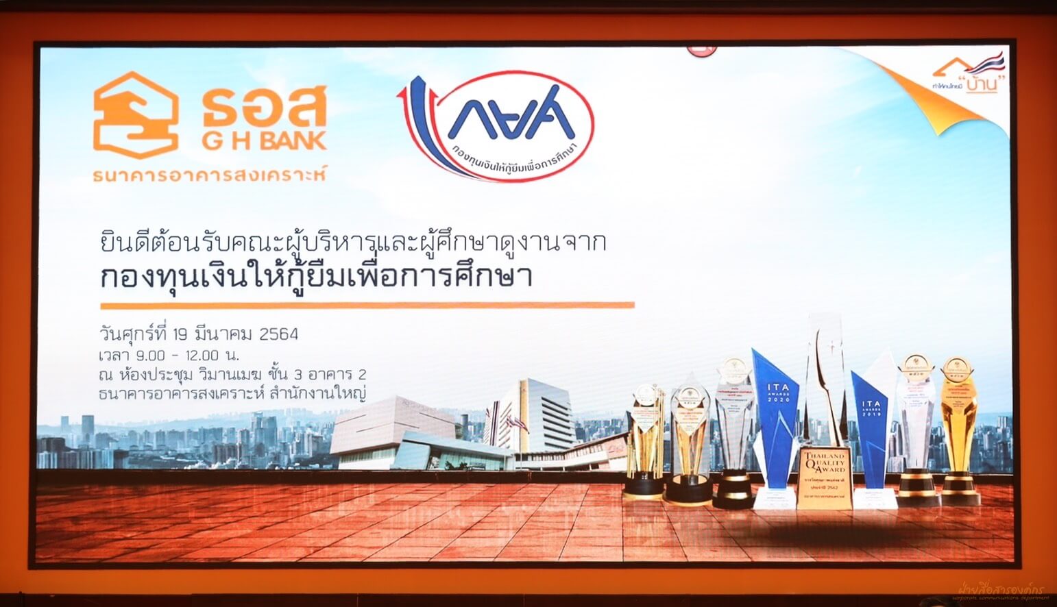 วันนี้ (19 มีนาคม 2564) ธนาคารอาคารสงเคราะห์ ในฐานะองค์กรที่เป็น Best Practice ที่ได้รางวัลประเมินคุณธรรมและความโปร่งใสในการดำเนินงานของหน่วยงานภาครัฐ (ITA) ได้ให้การต้อนรับคณะผู้บริหารจากกองทุนเงินให้กู้ยืมเพื่อการศึกษา นำโดยคุณชัยณรงค์ กัจฉปานันท์ ผู้จัดการกองทุนเงินให้กู้ยืมเพื่อการศึกษา ซึ่งมีคุณฉัตรชัย ศิริไล กรรมการผู้จัดการ พร้อมด้วยคณะผู้บริหารของธนาคาร ร่วมแบ่งปันความรู้ ประสบการณ์ วิธีปฏิบัติที่เป็นเลิศในการประเมินคุณธรรมและความโปร่งใสในการดำเนินงาน ทั้งการใช้เทคนิคการเพิ่มระดับคะแนน ITA สร้างแรงบันดาลในการปฏิบัติงาน และบทบาทของผู้บริหารที่มีส่วนช่วยสนับสนุนภายในองค์กร รวมถึงการนำองค์ความรู้ต่าง ๆ ขององค์กร อาทิ การยกระดับคะแนน ITA ,การสร้างแรงบันดาลใจภายในองค์กร , แนวทางในการดำเนินงาน ITA ปี 2564 เป็นต้น มาช่วยพัฒนางาน ส่งผลให้ธนาคารมีผลคะแนน ITA สูงสุดเป็นอันดับหนึ่ง ติดต่อกัน 4 ปี อีกทั้งยังเปิดโอกาสให้ซักถามและได้แบ่งปันประสบการณ์ เพื่อยกระดับคะแนน ITA ของกองทุนเงินให้กู้ยืมเพื่อการศึกษาให้อยู่ในระดับ AA (95 คะแนนขึ้นไป) ซึ่งคณะผู้เข้าศึกษาดูงานได้รับความรู้และชื่นชมแนวทางการบริหารจัดการของธนาคารเป็นอย่างยิ่ง ทั้งนี้ การแลกเปลี่ยนเรียนรู้ดังกล่าวจัดขึ้น ณ ห้องวิมานเมฆ ชั้น 3 อาคาร 2 ธนาคารอาคารสงเคราะห์ สำนักงานใหญ่