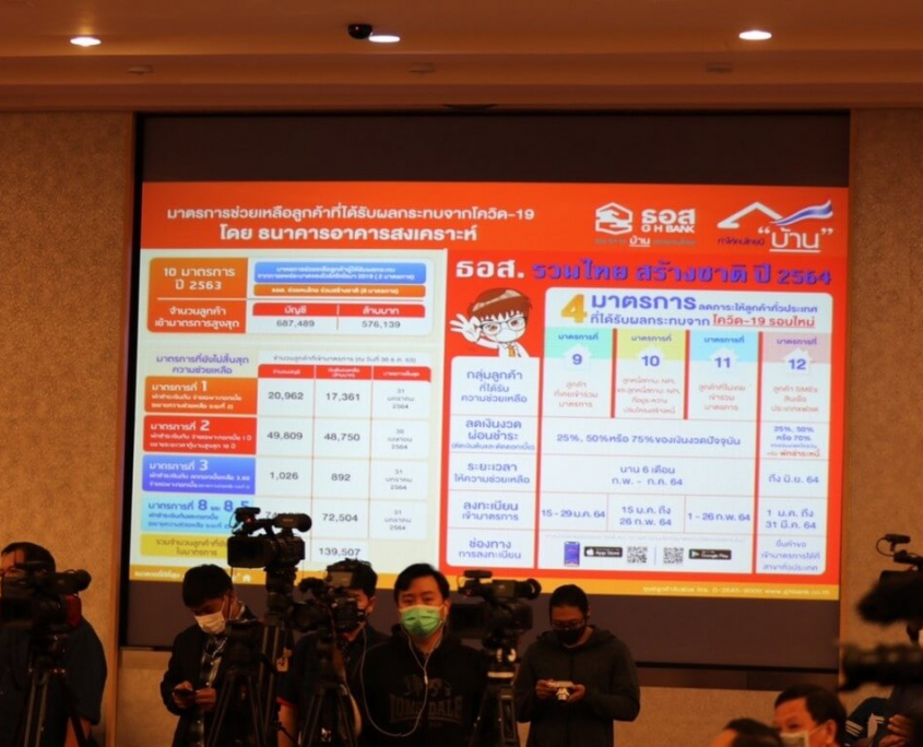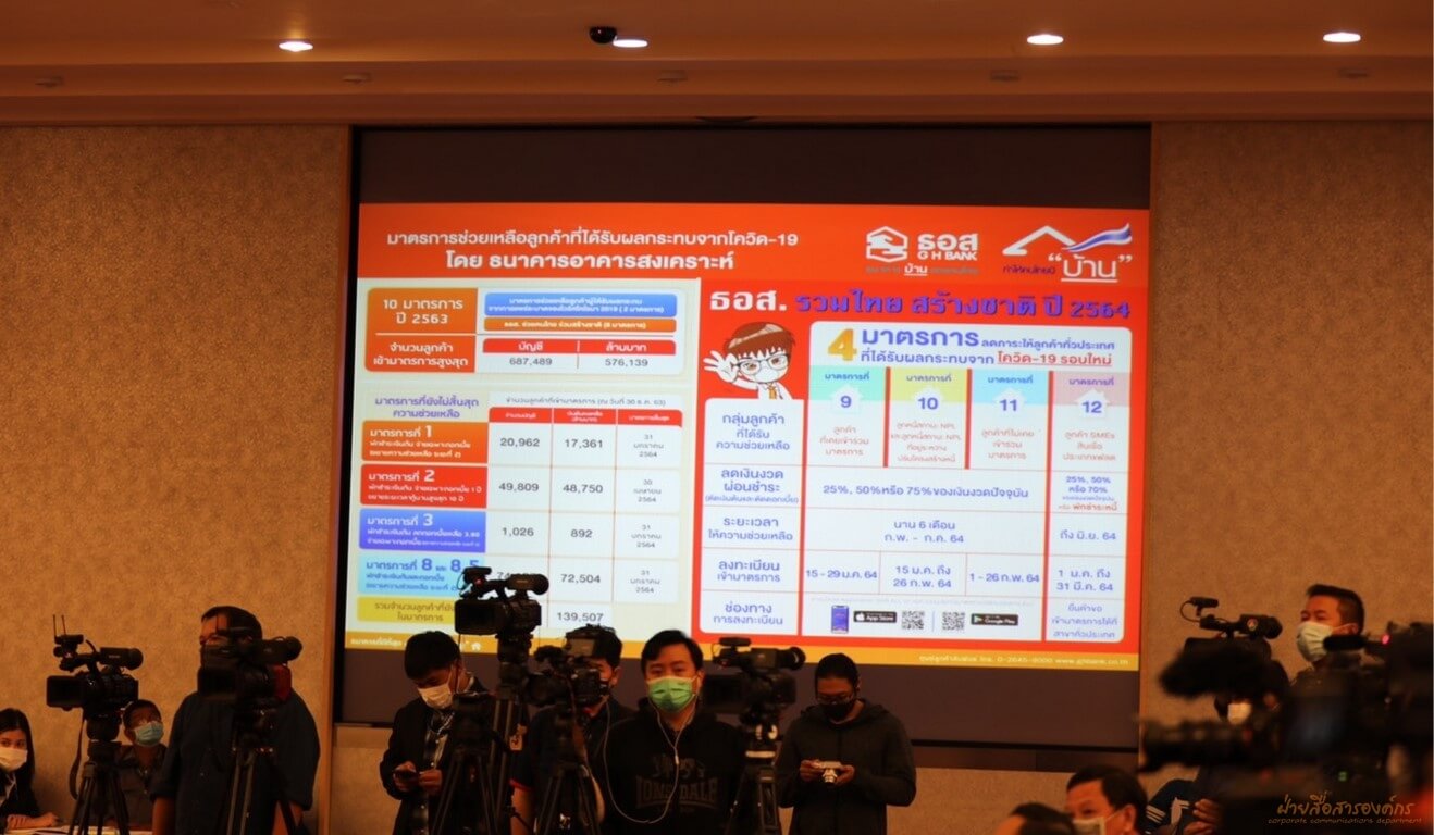 เมื่อวันที่ 12 ม.ค. 64 คุณฉัตรชัย ศิริไล กรรมการผู้จัดการ ร่วมแถลงข่าวมาตรการด้านการเงินเพื่อดูแลและเยียวยาผู้ได้รับผลกระทบจากไวรัสโคโรนา 2019 (COVID-19) โดย ธอส. ได้จัดทำมาตรการช่วยเหลือลูกค้าที่ได้รับผลกระทบด้านรายได้จากโควิด-19 ผ่าน “โครงการ ธอส. รวมไทย สร้างชาติ ปี 2564” ด้วย 4 มาตรการ(มาตรการที่ 9-12) ลดเงินงวดผ่อนชำระ(ตัดเงินต้นและตัดดอกเบี้ยเหลือ 25% หรือ 50% หรือ 70% หรือ 75%) นานสูงสุด 6 เดือน ครอบคลุมทั้งลูกค้าที่เคยหรืออยู่ระหว่างใช้ “มาตรการช่วยเหลือลูกค้าผู้ได้รับผลกระทบจากการแพร่ระบาดของไวรัสโคโรนา 2019 (COVID-19)” และ “โครงการ ธอส. ช่วยคนไทย ร่วมสร้างชาติ” รวมถึงลูกค้าที่ไม่เคยเข้าร่วมมาตรการฯ ทั้งลูกค้ารายย่อยและกลุ่ม SMEs ที่มีสถานะปกติ หรือสถานะ NPL โดยมี คุณอาคม เติมพิทยาไพสิฐ รัฐมนตรีว่าการกระทรวงการคลัง พร้อมด้วย คุณกฤษฎา จีนะวิจารณะ ปลัดกระทรวงการคลัง คุณกุลยา ตันติเตมิท ผู้ตรวจราชการกระทรวงการคลัง รักษาราชการแทนผู้อำนวยการสำนักงานเศรษฐกิจการคลัง และผู้บริหารสถาบันการเงินของรัฐเข้าร่วมงานแถลงข่าว ทั้งนี้ งานแถลงข่าวดังกล่าวจัดขึ้น ณ ห้องวายุภักษ์ 4 ชั้น 4 กระทรวงการคลัง