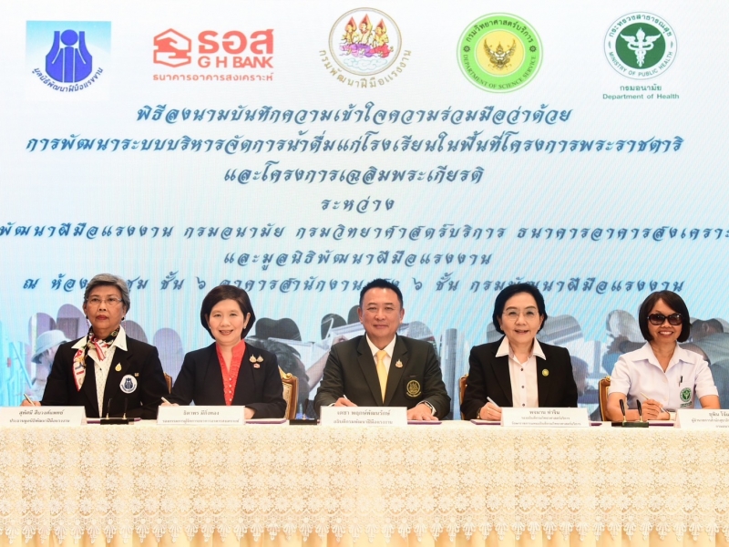นายกมลภพ วีระพละ กรรมการผู้จัดการธนาคารอาคารสงเคราะห์ (ธอส.) เปิดเผยว่า ธอส. ร่วมลงนามบันทึกความเข้าใจความร่วมมือ (MOU) ว่าด้วยการพัฒนาระบบบริหารจัดการน้ำดื่มแก่โรงเรียนในพื้นที่โครงการพระราชดำริและโครงการเฉลิมพระเกียรติ โดยมีนางสาวธิดาพร มีกิ่งทอง รองกรรมการผู้จัดการ กลุ่มงานปฏิบัติการ เป็นผู้แทนธนาคารลงนาม ร่วมกับ นายเดชา พฤกษ์พัฒนรักษ์ อธิบดีกรมพัฒนาฝีมือแรงงาน กรมพัฒนาฝีมือแรงงาน นางพจมาน ท่าจีน รองอธิบดีกรมวิทยาศาสตร์บริการ รักษาราชการแทนอธิบดีกรมวิทยาศาสตร์บริการ กรมวิทยาศาสตร์บริการ นางสาวยุพิน โจ้แปง ผู้อำนวยการสำนักสุขาภิบาลอาหารและน้ำ กรมอนามัย และนางสุทัศนี สืบวงศ์แพทย์ ประธานมูลนิธิพัฒนาฝีมือแรงงาน มูลนิธิพัฒนาฝีมือแรงงาน ซึ่งการลงนามดังกล่าวเป็นความร่วมมือของ 5 หน่วยงาน เพื่อบูรณาการพัฒนาและจัดการคุณภาพน้ำอุปโภคและน้ำบริโภคให้แก่โรงเรียนในพื้นที่โครงการพระราชดำริและโครงการเฉลิมพระเกียรติทั่วประเทศ ยกระดับคุณภาพชีวิตของนักเรียน ครู และประชาชนในพื้นที่ห่างไกล ให้สามารถเข้าถึงน้ำดื่มที่สะอาด ปลอดภัยได้มาตรฐาน ถ่ายทอดองค์ความรู้และทักษะการดูแลบำรุงรักษาระบบแก่บุคลากรในโรงเรียนและชุมชน เพื่อให้สามารถดูแลบำรุงรักษาระบบและยั่งยืน ซึ่งการดำเนินงานในครั้งนี้เป็นส่วนหนึ่งของการดำเนินการด้านการแสดงความรับผิดชอบต่อสังคมและสิ่งแวดล้อม (CSR) ของธนาคาร ที่พร้อมยกระดับคุณภาพชีวิตให้แก่ประชาชนได้อย่างมีประสิทธิภาพมากขึ้น ภายใต้แนวคิดการพัฒนาคนและชุมชนให้เข้มแข็งอย่างยั่งยืน สอดคล้องกับพันธกิจ “ทำให้คนไทยมีบ้าน” อย่างยั่งยืนของ ธอส. ทั้งนี้ พิธีลงนามบันทึกความเข้าใจความร่วมมือ ว่าด้วยการพัฒนาระบบบริหารจัดการน้ำดื่มแก่โรงเรียนในพื้นที่โครงการพระราชดำริและโครงการเฉลิมพระเกียรติระหว่าง 5 หน่วยงาน จัดขึ้น ณ กรมพัฒนาฝีมือแรงงาน กระทรวงแรงงาน ถนนมิตรไมตรี เขตดินแดง กรุงเทพมหานคร เมื่อวันที่ 30 กันยายน 2568