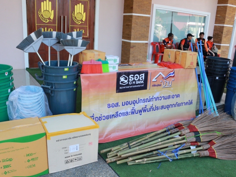 นายเดชา พฤกษ์พัฒนรักษ์ กรรมการธนาคารอาคารสงเคราะห์ ในฐานะประธานกรรมการกำกับดูแลกิจการที่ดีและความรับผิดชอบต่อสังคมและสิ่งแวดล้อม (CG&CSR) เปิดเผยว่า จากสถานการณ์อุทกภัยในพื้นที่จังหวัดสงขลา ส่งผลให้บ้านเรือนประชาชนได้รับความเสียหาย ธอส. ในฐานะสถาบันการเงินเฉพาะกิจของรัฐ ที่มีพันธกิจ “ทำให้คนไทยมีบ้าน” พร้อมช่วยฟื้นฟูที่อยู่อาศัยให้กับประชาชนให้กลับเข้าสู่สภาวะปกติ ได้ลงพื้นที่มอบอุปกรณ์ทำความสะอาด จำนวนกว่า 6,000 ชิ้น อาทิ ไม้กวาดทางมะพร้าว ไม้กวาดด้ามพลาสติก ด้ามสแตนเลส แปรงขัดพื้นเอนกประสงค์ แปรงขัดพื้นพลาสติก ถังน้ำ 12 ลิตร และหน้ากากอนามัยทางการแพทย์ ให้แก่ประชาชนในพื้นที่ประสบอุทกภัยจังหวัดสงขลา โดยมีนายชัยรัตน์ แก้วเพียงเพ็ญ รองอธิบดีกรมป้องกันและบรรเทาสาธารณภัย เป็นผู้รับมอบ พร้อมกันนี้ธนาคารยังให้คำแนะนำแนวทางการให้ความช่วยเหลือ เยียวยา และฟื้นฟู ตามนโยบายของสมาคมสถาบันการเงินของรัฐ เพื่อช่วยบรรเทาความเดือดร้อนให้แก่ผู้ประสบอุทกภัยภาคใต้