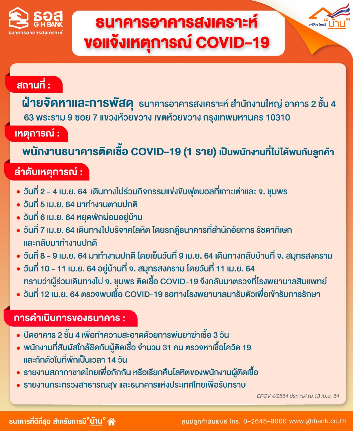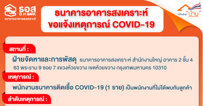 ธนาคารอาคารสงเคราะห์ ได้รับรายงานว่า ในวันนี้(จันทร์ที่ 12 เมษายน 2564) เวลาประมาณ 18.30 น. มีพนักงานของธนาคารจำนวน 1 ราย จากฝ่ายจัดหาและการพัสดุ ปฏิบัติงานอยู่บริเวณอาคาร 2 ชั้น 4 ธนาคารอาคารสงเคราะห์ สำนักงานใหญ่ และไม่ได้ปฏิบัติงานที่มีส่วนเกี่ยวข้องกับการให้บริการลูกค้า ได้รับการแจ้งยืนยันผลการตรวจจากแพทย์ว่า “ติดเชื้อ COVID-19” ภายหลังจากเดินทางไปตรวจหาเชื้อเมื่อวันอาทิตย์ที่ 11 เมษายน 2564 เนื่องจากได้รับแจ้งว่า มีผู้ที่ร่วมเดินทางไปแข่งขันฟุตบอลร่วมกันที่ จ.ชุมพร ระหว่างวันที่ 2-4 เมษายน 2564 ติดเชื้อ COVID-19