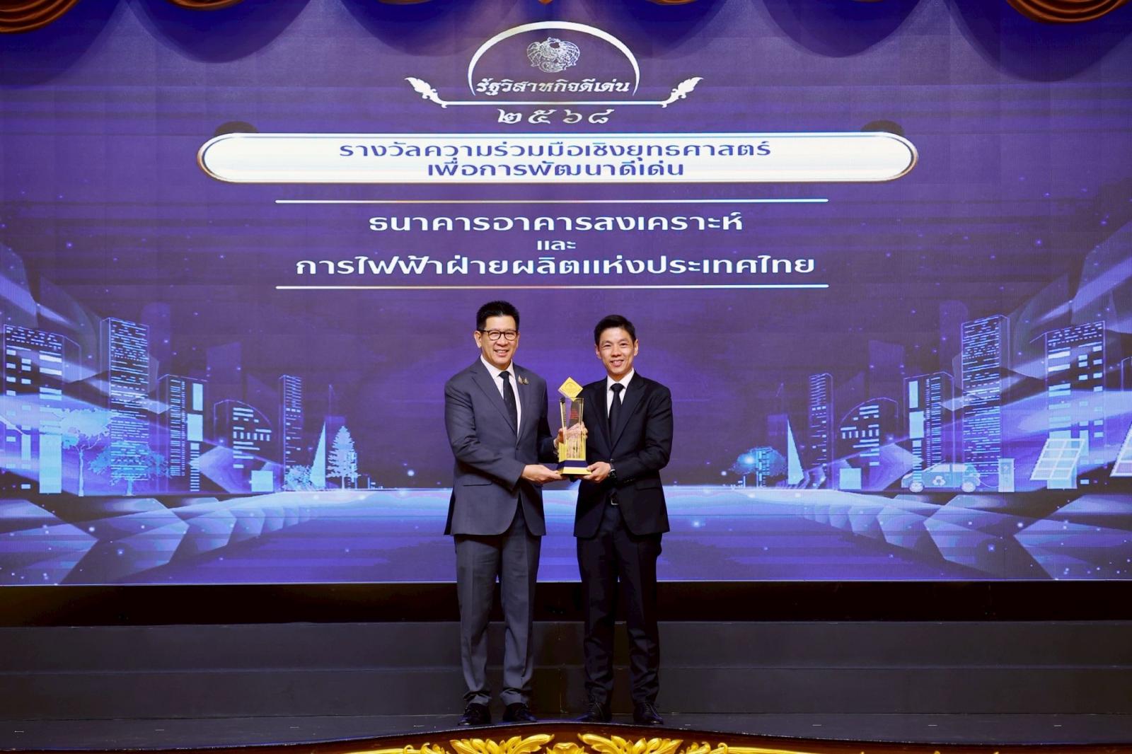 1. รางวัลความร่วมมือเชิงยุทธศาสตร์เพื่อการพัฒนาดีเด่น ประเภทรางวัลดีเด่น จากโครงการ "ยกระดับบ้านประหยัดพลังงานอย่างยั่งยืนเพื่อคนไทย" ระหว่างธนาคารอาคารสงเคราะห์ (ธอส.) และ การไฟฟ้าฝ่ายผลิตแห่งประเทศไทย (กฟผ.) ซึ่งเป็นโครงการต่อเนื่องตั้งแต่ปี 2566 โดยดำเนินการร่วมกันภายใต้กลยุทธ์ “3REs Strategy” (Renovate, Refinance, Reinforce PR) เพื่อสนับสนุนให้ประชาชนเข้าถึงที่อยู่อาศัยประหยัพลังงานตามมาตรฐาน “บ้านเบอร์ 5” ได้ง่ายขึ้น ซึ่ง ธอส. ได้ออกแบบและพัฒนาผลิตภัณฑ์สินเชื่ออัตราดอกเบี้ยพิเศษแบบ Tailor-made เพื่อจูงใจลูกค้ากลุ่มผู้ประกอบการพัฒนาอสังหาริมทรัพย์ ให้ลงทุนสร้างบ้านประหยัดพลังงาน และมอบสิทธิประโยชน์แก่ลูกค้าผู้ที่ต้องการมีบ้านใหม่ ขยายผลครอบคลุมถึงการปรับปรุงบ้านเดิมให้สามารถเข้าถึงวัสดุอุปกรณ์ที่อยู่อาศัยแบบประหยัดพลังงานเช่นกัน ถือเป็นการสร้างความมั่นคงด้านพลังงาน และ “ทำให้คนไทยมีบ้าน” อย่างยั่งยืน ขับเคลื่อนสังคมไทยสู่การเติบโตที่เป็นมิตรต่อสิ่งแวดล้อมและบรรลุเป้าหมายการลดการปล่อยก๊าซเรือนกระจกอย่างเป็นรูปธรรม