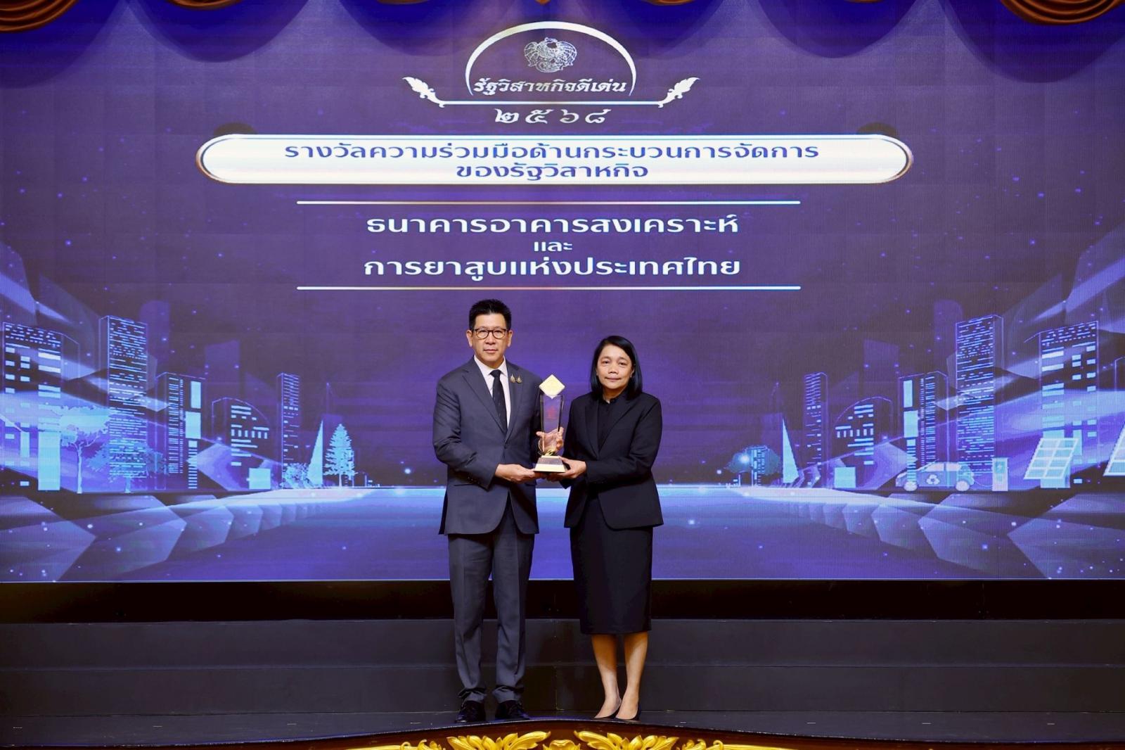 3. รางวัลความร่วมมือด้านกระบวนการจัดการของรัฐวิสาหกิจ ประเภทรางวัลดีเด่น จากโครงการความร่วมมือด้านกระบวนการจัดการของรัฐวิสาหกิจ ระหว่างธนาคารอาคารสงเคราะห์ (ธอส.) และการยาสูบแห่งประเทศไทย (ยสท.) ซึ่งรางวัลดังกล่าวเป็นการดำเนินการตามโครงการคู่ความร่วมมือของรัฐวิสาหกิจตามนโยบายที่ สคร. กำหนดอย่างต่อเนื่อง โดยในปี 2568 ธอส. และ ยสท. ได้เพิ่มการแลกเปลี่ยนเรียนรู้ร่วมกันผ่าน 3 เรื่องสำคัญ ได้แก่ 1) แผนการดำเนินงาน Core Business Enablers 2) การแลกเปลี่ยนเรียนรู้ (Knowledge Sharing) และ 3) การแบ่งปันทรัพยากร (Resource Sharing) ระบบ Operational Risk Management System (ORMS)