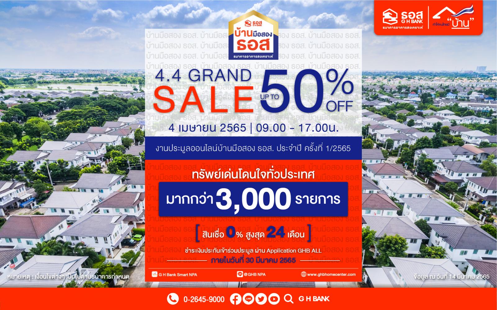 กลับมาอีกครั้ง!! งานประมูลออนไลน์บ้านมือสอง ธนาคารอาคารสงเคราะห์ 4.4 Grand Sale คัดทรัพย์ดีทั่วประเทศมากถึง 3,661 รายการ มาเปิดประมูลผ่าน Application : G H Bank Smart NPA แบ่งเป็นทรัพย์ในพื้นที่กรุงเทพฯ และปริมณฑล 1,086 รายการ และทรัพย์ในภูมิภาค 2,575 รายการ ราคาเริ่มต้นประมูลลดสูงสุดถึง 50% จากราคาปกติ ราคาต่ำสุดเพียง 45,000 บาทเท่านั้น พิเศษ!! ผู้ชนะการประมูลสามารถรับสิทธิ์โปรโมชั่นสินเชื่อดอกเบี้ย 0% นานสูงสุด 24 เดือน เริ่มประมูลพร้อมกันวันจันทร์ที่ 4 เมษายน 2565 นี้ เวลา 09.00-17.00 น.