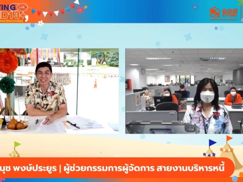 เมื่อวันที่ 8 เม.ย. 65 คุณฉัตรชัย ศิริไล กรรมการผ͊ ้จัดการ เข้าร่วมกิจกรรม Meeting with MD13+ ครั้งที่ 1/2022 รูปแบบ New Normal โดย Live Streaming ผ่านทาง Facebook : GHB Info Supermarket เพื่อให้ผู้ปฏิบัติงานธนาคาร ได้รับทราบถึงผลการดำเนินงานสำคัญของธนาคารในไตรมาสแรกของปี 2565 และตอบข้อสงสัยในเรื่องที่ผู้ปฏิบัติงานให้ความสนใจ โดยมีรองกรรมการผู้จัดการ และผู้ช่วยกรรมการผู้จัดการของแต่ละ 7 กลุ่มงาน ร่วมอัพเดทความคืบหน้าในการจัดทำโครงการสำคัญต่าง ๆ ของแต่ละกลุ่มงาน และแผนการดำเนินงานในระยะต่อไปด้วยการเข้าระบบ Live Streaming จากพื้นที่ปฏิบัติงานของกลุ่มงานตนเอง ซึ่งมีผู้เข้าร่วมรับชมการถ่ายทอดสดรวมมากกว่า 1,300 คน พร้อมกันนี้ ยังมีการจัดกิจกรรมให้ร่วมสนุกตอบคำถามถูก 10 ข้อ จำนวน 50 ท่านแรก รับกระเป๋าผ้า Super Brand รุ่นใหม่ล่าสุด และเนื่องในโอกาสวันขึ้นปีใหม่ไทย กรรมการผู้จัดการ ได้อวยพรแก่พนักงาน และจัดให้มีการแจกขนมไทยโป๊งเหน่งจำนวน 666 ลูก ให้กับผู้ปฏิบัติงานในสำนักงานใหญ่ที่เปลี่ยน Lock Screen หน้าจอมือถือเป็น GHB ALL GEN เพื่อรวมพลัง GHB 1 Team รวมถึงกระตุ้นส่งเสริมให้พนักงานปฏิบัติตนตามแบบอย่างที่ดีตามค่านิยม GIVE +4 ของธนาคารอีกด้วย ทั้งนี้ ศูนย์กลางการจัด͊ ิจกรรมดังกล่าวมีขึ้น ณ โถงนิติกรรม ฝ่ายพิธีการสินเชื่อ อาคาร 2 ชั้น 1 สำนักงานใหญ่