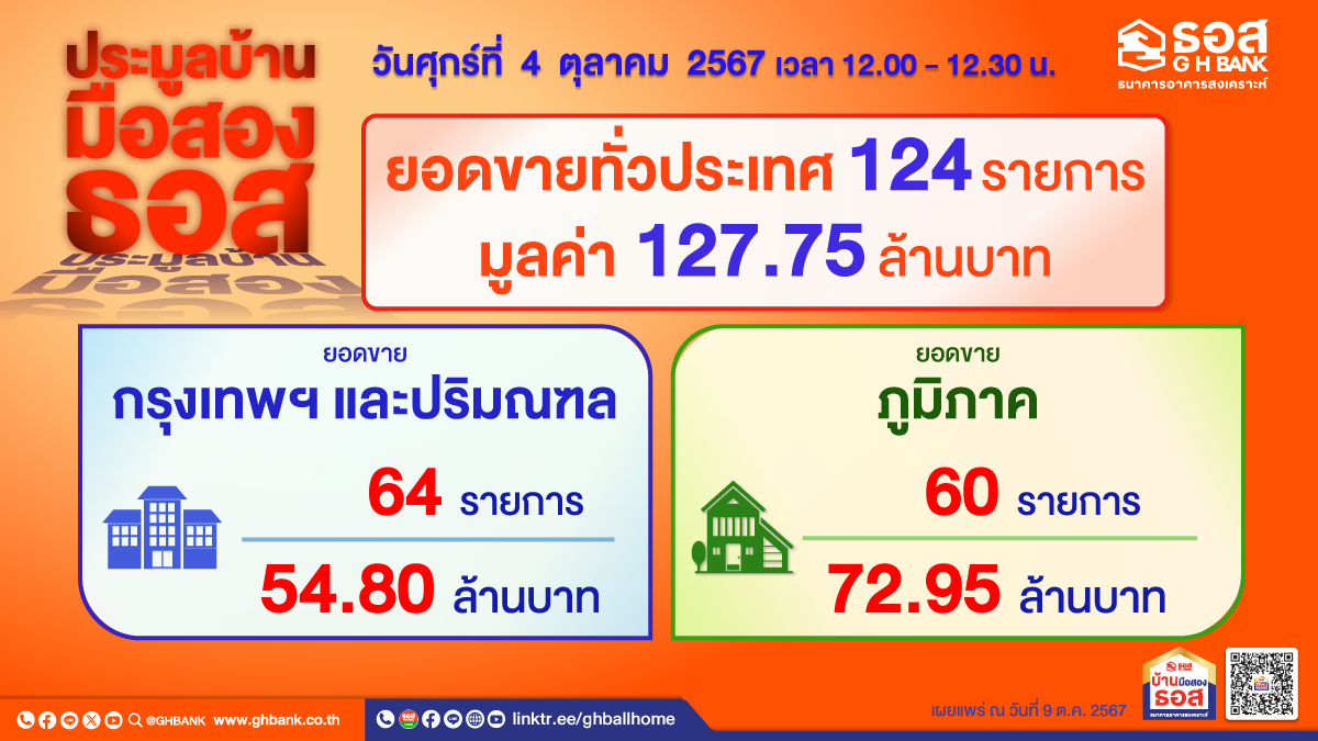 ธนาคารอาคารสงเคราะห์ (ธอส.) ทำให้คนไทยได้มีที่อยู่อาศัยเป็นของตนเองเพิ่มขึ้นกับบ้านมือสอง ธอส. โดยการจัด “งานประมูลบ้านมือสองออนไลน์ : GHB’S NPA Online Auction 2024” ประจำเดือนตุลาคม 2567 ซึ่งจัดขึ้นเมื่อวันศุกร์ที่ 4 ตุลาคม 2567 ระหว่างเวลา 12.00 - 12.30 น. พร้อมกันทั่วประเทศ ผ่าน Application : GHB ALL HOME โดยภายในงาน ธอส. สามารถจำหน่ายบ้านมือสองได้จำนวน 124 รายการ เป็นมูลค่ารวม 127.75 ล้านบาท แบ่งเป็น ทรัพย์ที่ตั้งอยู่ในพื้นที่กรุงเทพฯ และปริมณฑล จำนวน 64 รายการ รวมมูลค่า 54.80 ล้านบาท และในส่วนภูมิภาค จำนวน 60 รายการ รวมมูลค่า 72.95 ล้านบาท โดยรายการทรัพย์ที่ประมูลได้ในราคาต่ำที่สุดเพียง 305,000 บาท เป็นทรัพย์ประเภททาวน์เฮ้าส์ ขนาดเนื้อที่ 16.2 ตารางวา ในพื้นที่อำเภอธัญบุรี จังหวัดปทุมธานี และทรัพย์ที่ประมูลในราคาสูงสุด เป็นทรัพย์ประเภทบ้านเดี่ยว ขนาดเนื้อที่ 58.10 ตารางวา ในพื้นที่อำเภอเมืองสมุทรสาคร จังหวัดสมุทรสาคร โดยประมูลขายได้ในราคา 3,620,000 บาท พิเศษ! ผู้ชนะการประมูล สามารถใช้ “ผลิตภัณฑ์สินเชื่อสำหรับซื้อทรัพย์ NPA พร้อมขายของธนาคาร” (เงื่อนไขเป็นไปตามหลักเกณฑ์ที่ธนาคารกำหนด) โดยสอบถามข้อมูลเพิ่มเติมได้ที่ G H Bank Call Center โทร.0-2645-9000 กด 5 หรือ Facebook Fanpage ธนาคารอาคารสงเคราะห์ หรือดูข้อมูลบ้านมือสอง ธอส. ได้ที่ www.ghbhomecenter.com และ Mobile Application : GHB ALL HOME