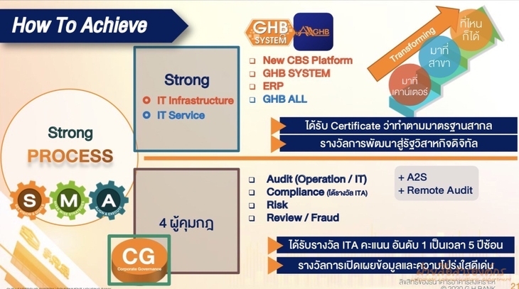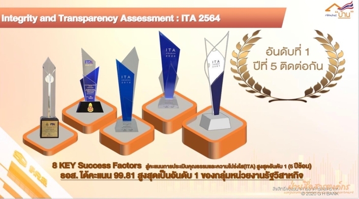 เมื่อวันที่ 25 กุมภาพันธ์ 2565 นายฉัตรชัย ศิริไล กรรมการผู้จัดการได้มอบหมายให้ นายกฤษดา ปัทมะผลิน ผู้อำนวยการฝ่ายกำกับการปฏิบัติงาน สายงานกำกับกฎเกณฑ์และกฎหมาย กลุ่มงานปฏิบัติการ เป็นวิทยากรบรรยายในหัวข้อ “การดำเนินงานเรื่องคุณธรรมและความโปร่งใสของหน่วยงานภาครัฐ ITA ” ตามคำเชิญของบริษัท ทริส คอร์ปอเรชั่น จำกัด (ทริส) ในโครงการจัดทำแผนแม่บทการบริหารและพัฒนาทรัพยากรบุคคลของกรมการขนส่งทางบก ประจำปีงบประมาณ พ.ศ. 2562-2571 (ระยะที่ 2) ซึ่งผู้เข้าอบรมเป็นข้าราชการของกรมการขนส่งทางบก จำนวน 200 ราย ด้วยบริษัท ทริส คอร์ปอเรชั่น จำกัด (ทริส) ได้พิจารณาว่า ธอส. เป็นหน่วยงาน Best Practice จึงได้เชิญให้ ธอส. ร่วมแบ่งปันประสบการณ์ความสำเร็จในการดำเนินงาน โดยเนื้อหาในการบรรยายประกอบไปด้วย การดำเนินงานภายใต้หลักการ “Good Result Come From Good Process” หรือ “ผลลัพธ์ที่ดีมาจากกระบวนการที่ดี” รวมทั้งการดำเนินการที่เป็นระบบอย่างต่อเนื่องโดยใช้ 8 Key Success Factors ประกอบด้วย 1. Leadership 2. Employee Engagement & Awareness 3. Digitized Communication 4. Participation 5. Technology 6. Learning 7. Agility และ 8. Resilience ผลสำเร็จจาก 8 Key Success Factors สู่คะแนนการประเมินคุณธรรมและความโปร่งใสในการดำเนินงานของหน่วยงานภาครัฐ (ITA) ได้ในระดับ AA ด้วยระดับคะแนน 99.81 สูงสุดเป็นอันดับ 1 ของหน่วยงานรัฐวิสาหกิจ (5 ปีติดต่อกัน) ทั้งนี้ การบรรยายดังกล่าวได้ถ่ายทอดผ่านระบบ Zoom จากฝ่ายกำกับการปฏิบัติงาน ชั้น 17 อาคาร 2 ธนาคารอาคารสงเคราะห์ สำนักงานใหญ่ ไปยังผู้เข้ารับการอบรมของกรมการขนส่งทางบก ทั้งส่วนกลางและส่วนภูมิภาค ทั่วประเทศ
