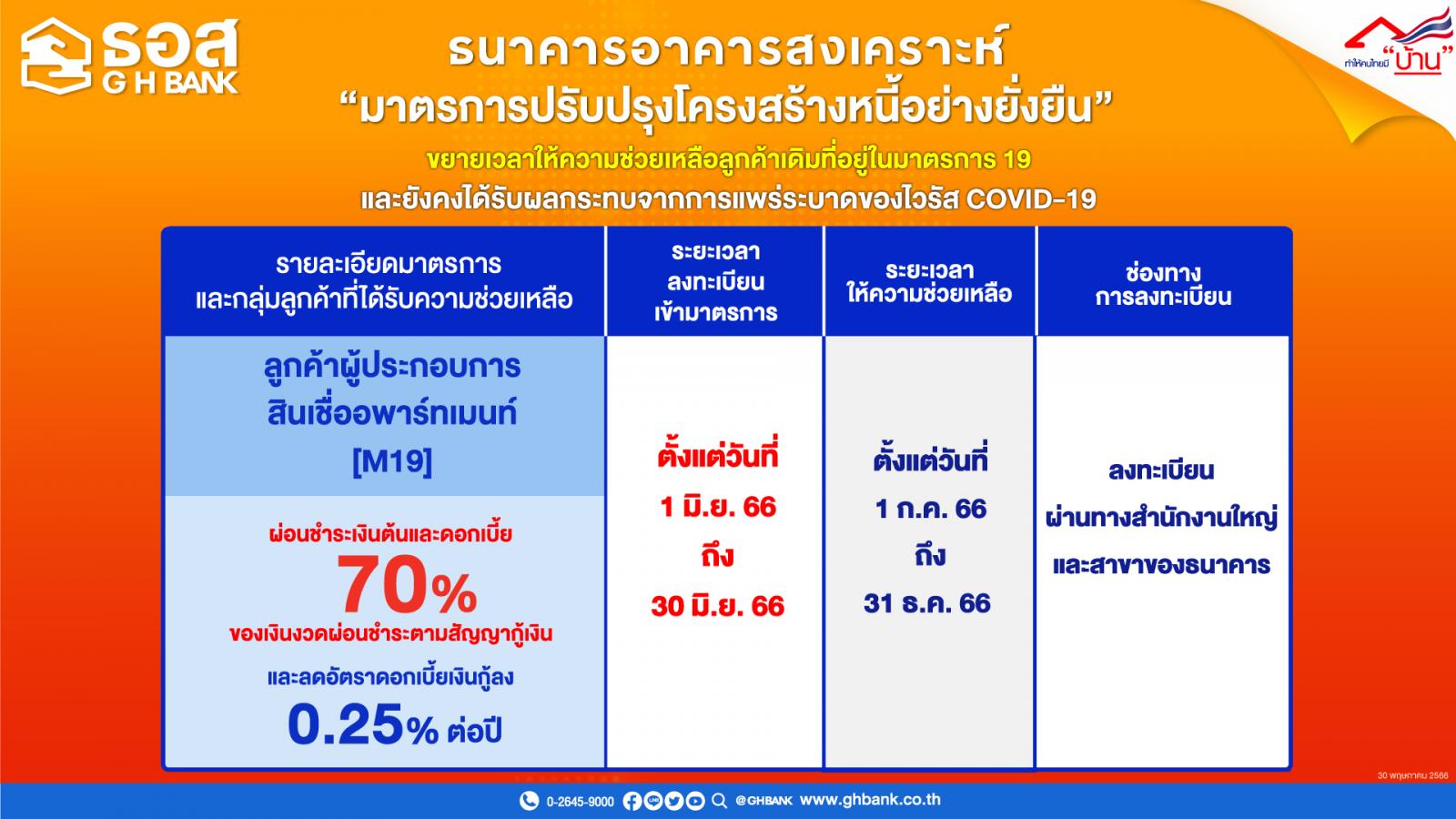 “ตามที่ธนาคารอาคารสงเคราะห์ได้มีมาตรการปรับปรุงโครงสร้างหนี้อย่างยั่งยืน (มาตรการที่ 19) เฟสที่ 4 กำหนดระยะเวลาให้ความช่วยเหลือ ตั้งแต่วันที่ 1 กรกฎาคม 2566 และจะสิ้นสุดในวันที่ 31 ธันวาคม 2566 นั้น