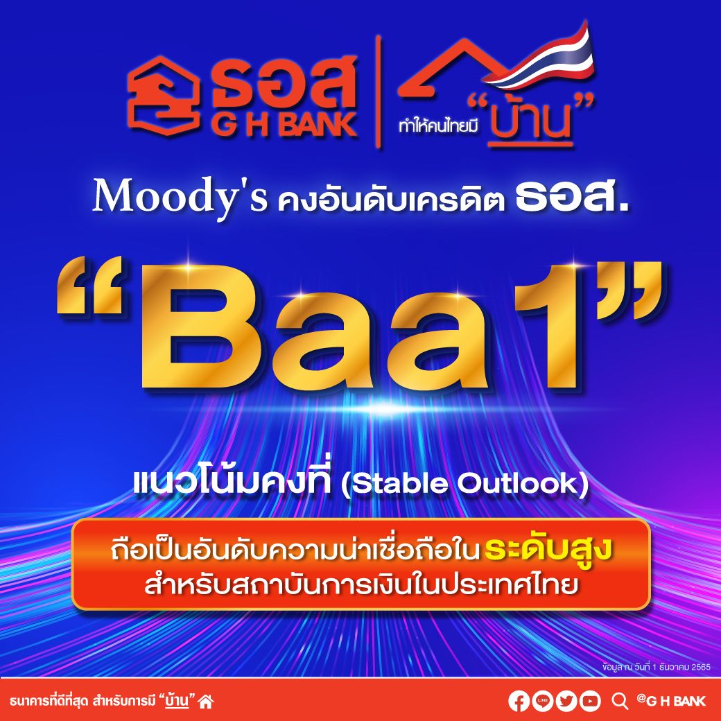 ธนาคารอาคารสงเคราะห์ เผย Moody's สถาบันการจัดอันดับเครดิตระดับสากล คงอันดับเครดิตองค์กรของ ธอส. ในระดับ Baa1 และแนวโน้มอันดับเครดิตของ ธอส. ในระดับคงที่ (Stable) ถือเป็นอันดับความน่าเชื่อถือในระดับสูงสำหรับสถาบันการเงินในประเทศไทย สะท้อนความแข็งแกร่งทางการเงินของธนาคาร และบริหารจัดการ NPL ได้อย่างมีประสิทธิภาพ