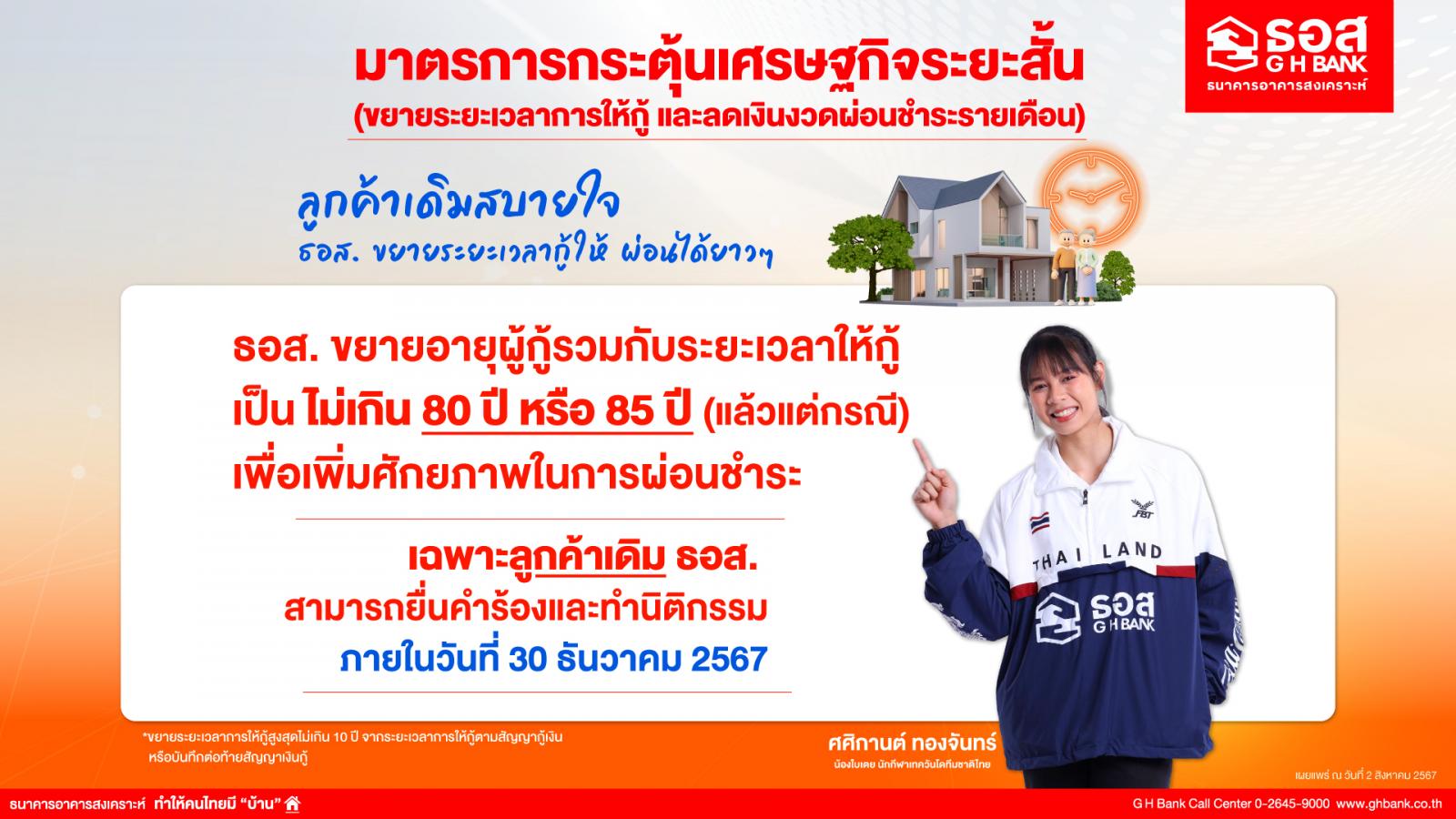 ธนาคารอาคารสงเคราะห์ (ธอส.) ดำเนินการตามนโยบายรัฐบาล และกระทรวงการคลัง จัดทำมาตรการกระตุ้นเศรษฐกิจระยะสั้น ด้วยการขยายระยะเวลาให้ลูกค้าผ่อนชำระเงินงวดได้ไม่เกิน 80 ปี หรือ 85 ปี จากเดิมผ่อนชำระเงินงวดได้ไม่เกิน 70 ปี หรือ 75 ปี เพื่อช่วยลดภาระค่าครองชีพ และเพิ่มศักยภาพในการผ่อนชำระ ผู้ที่สนใจสามารถยื่นคำร้องและทำนิติกรรมได้ที่ ธอส. ทุกสาขาทั่วประเทศ ตั้งแต่วันนี้ถึงวันที่ 30 ธันวาคม 2567