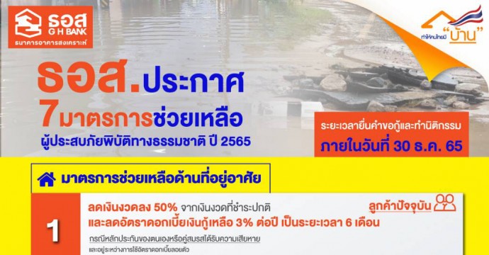 ธนาคารอาคารสงเคราะห์ ขานรับนโยบายรัฐบาล ในการช่วยเหลือลูกค้าที่ได้รับผลกระทบจาก “พายุโนรู” ที่ส่งผลให้มีฝนตกหนักในบางพื้นที่ เกิดน้ำท่วมฉับพลันและน้ำป่าไหลหลาก ด้วย “มาตรการช่วยเหลือผู้ประสบภัยพิบัติทางธรรมชาติปี 2565” 7 มาตรการ ประกอบด้วย 1. ลดเงินงวด 50% จากเงินงวดปกติ และลดอัตราดอกเบี้ยเหลือ 3% ต่อปี เป็นระยะเวลา 6 เดือน 2. ให้กู้เพิ่มหรือกู้ใหม่อัตราดอกเบี้ย 3.00% ต่อปี คงที่ 1 ปีแรก 3. ประนอมหนี้ระยะเวลาไม่เกิน 1 ปี 6 เดือน และคิดอัตราดอกเบี้ย 0% ต่อปี 6 เดือน ไม่ต้องชำระเงินงวด 4. ประนอมหนี้ไม่เกิน 1 ปี คิดอัตราดอกเบี้ย 0% ต่อปี นาน 6 เดือนแรก ผ่อนเงินงวดเพียง 1,000 บาท 5. กรณีเสียชีวิตหรือทุพพลภาพถาวรให้ผ่อนชำระดอกเบี้ย 0.01% ต่อปี 6. ที่อยู่อาศัยเสียหายทั้งหลังซ่อมแซมไม่ได้ ให้ปลอดหนี้ในส่วนของอาคาร และ 7. พิจารณาสินไหมเร่งด่วน (Fast Track) สำหรับลูกค้าที่ทำกรมธรรม์ประกันอัคคีภัย จ่ายตามความเสียหายจริงรวมทุกภัยธรรมชาติสูงสุด 30,000 บาทต่อปี