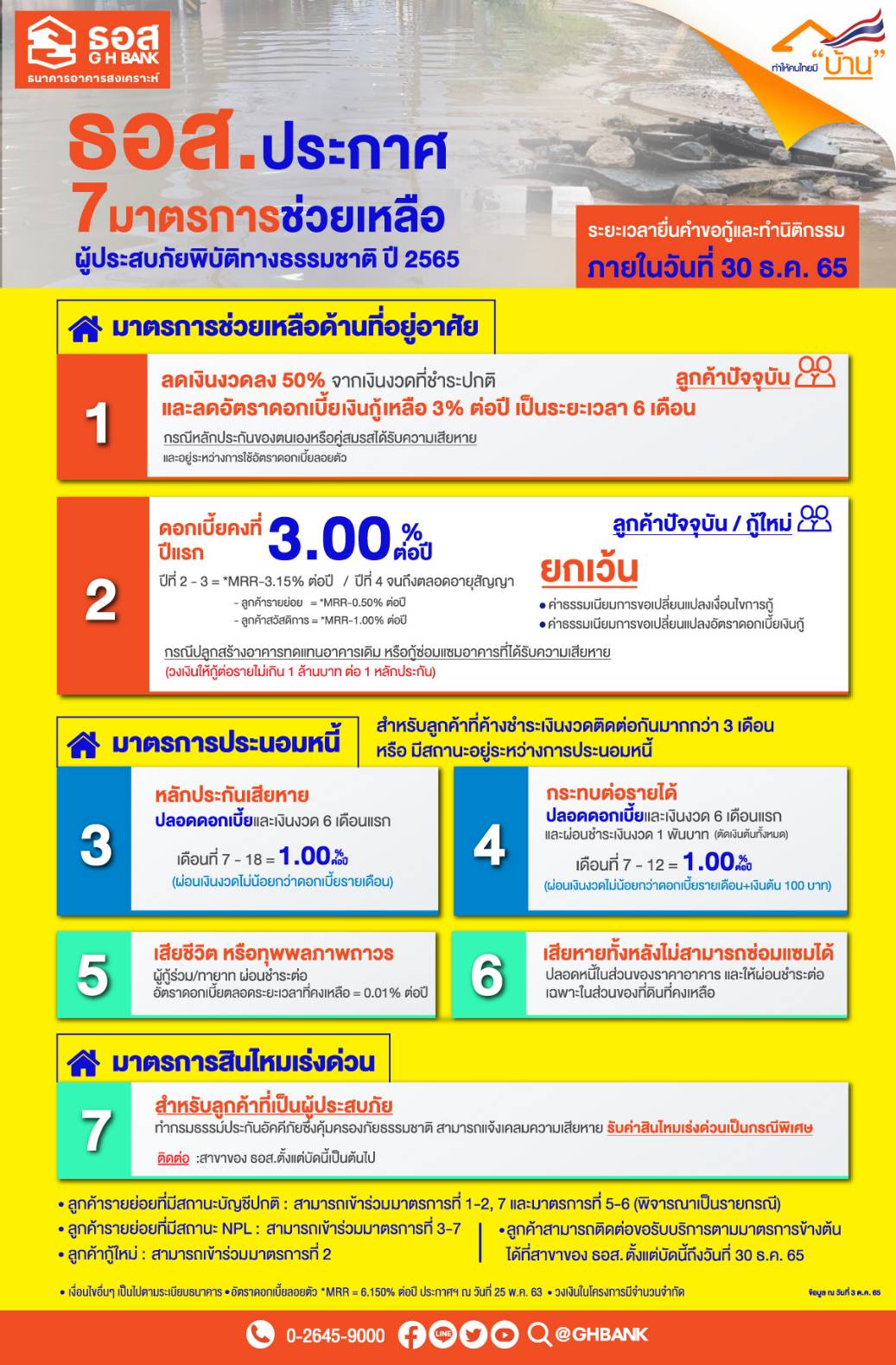 ทั้งนี้ ลูกค้าที่ประสงค์ขอรับบริการตามมาตรการที่ 1-6 สามารถติดต่อได้ที่สาขาของ ธอส. ตั้งแต่บัดนี้เป็นต้นไปถึงวันที่ 30 ธันวาคม 2565 และมาตรการที่ 7 ติดต่อได้ที่สาขาของ ธอส. ตั้งแต่บัดนี้เป็นต้นไป สอบถามรายละเอียดเพิ่มเติมได้ที่ G H Bank Call Center โทร 0-2645-9000 หรือ Facebook Fanpage ธนาคารอาคารสงเคราะห์ หรือที่ ธอส. ทุกสาขาทั่วประเทศ และติดตามข้อมูลข่าวสารได้ที่ Application : GHB ALL และเว็บไซต์ www.ghbank.co.th