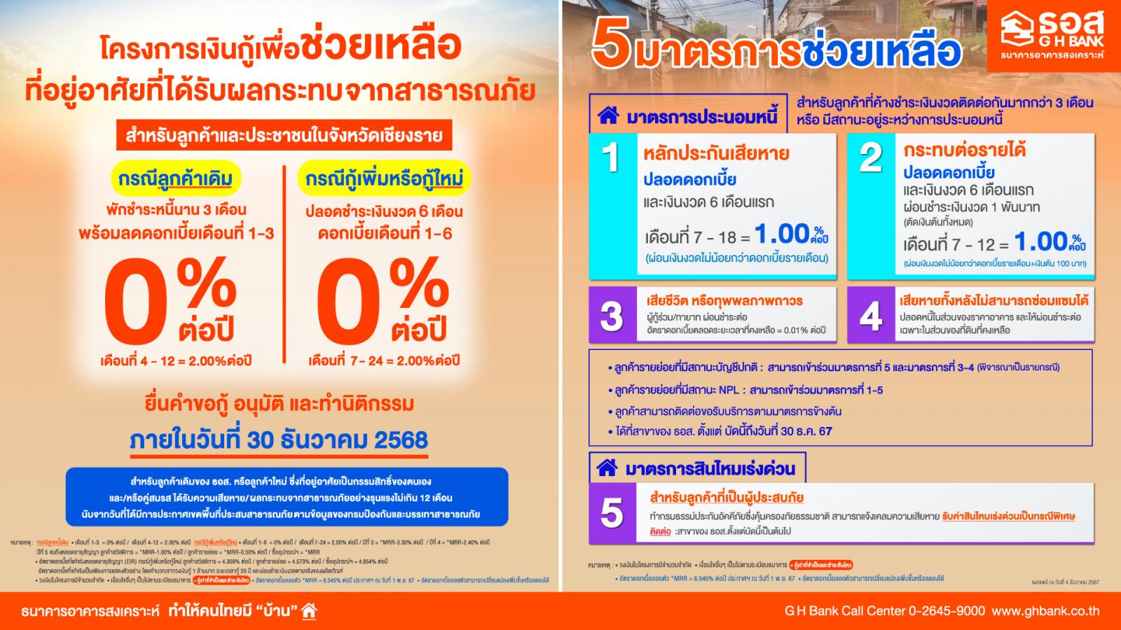 มาตรการที่ 5 : พิจารณาสินไหมเร่งด่วน (Fast Track) สำหรับลูกค้าที่ทำกรมธรรม์ประกันอัคคีภัยที่อยู่อาศัย ซึ่งคุ้มครองภัยธรรมชาติกับบริษัทประกันภัยที่ธนาคารจัดให้ พิจารณาจ่ายค่าสินไหมให้กับลูกค้าที่ประสบภัยทุกราย อย่างเร่งด่วนเป็นกรณีพิเศษ โดยผู้เอาประกันสามารถแจ้งความเสียหายโดยใช้ภาพถ่าย จ่ายตามความเสียหายจริงไม่เกิน 20,000 บาท และสำหรับลูกค้าที่มีกรมธรรม์เริ่มความคุ้มครองตั้งแต่วันที่ 1 พฤศจิกายน 2562 เพิ่มความคุ้มครองภัยธรรมชาติตามความเสียหายจริงอีกไม่เกิน 30,000 บาท ต่อปี (รายละเอียดและเงื่อนไขเป็นไปตามกรมธรรม์) โดยลูกค้าที่ประสงค์ขอรับบริการตามมาตรการที่ 1-4 สามารถติดต่อได้ที่สาขาของ ธอส. ตั้งแต่บัดนี้เป็นต้นไป ถึงวันที่ 30 ธันวาคม 2567 และมาตรการที่ 5 ติดต่อได้ที่สาขาของ ธอส. ตั้งแต่บัดนี้เป็นต้นไป โดยผู้ที่สนใจสามารถสอบถามรายละเอียดเพิ่มเติมได้ที่ ธอส. ทุกสาขาทั่วประเทศ หรือ G H Bank Call Center โทร 0-2645-9000 หรือ Facebook Fanpage ธนาคารอาคารสงเคราะห์ และ ติดตามข้อมูลข่าวสารได้ที่ Application : GHB ALL GEN และ www.ghbank.co.th