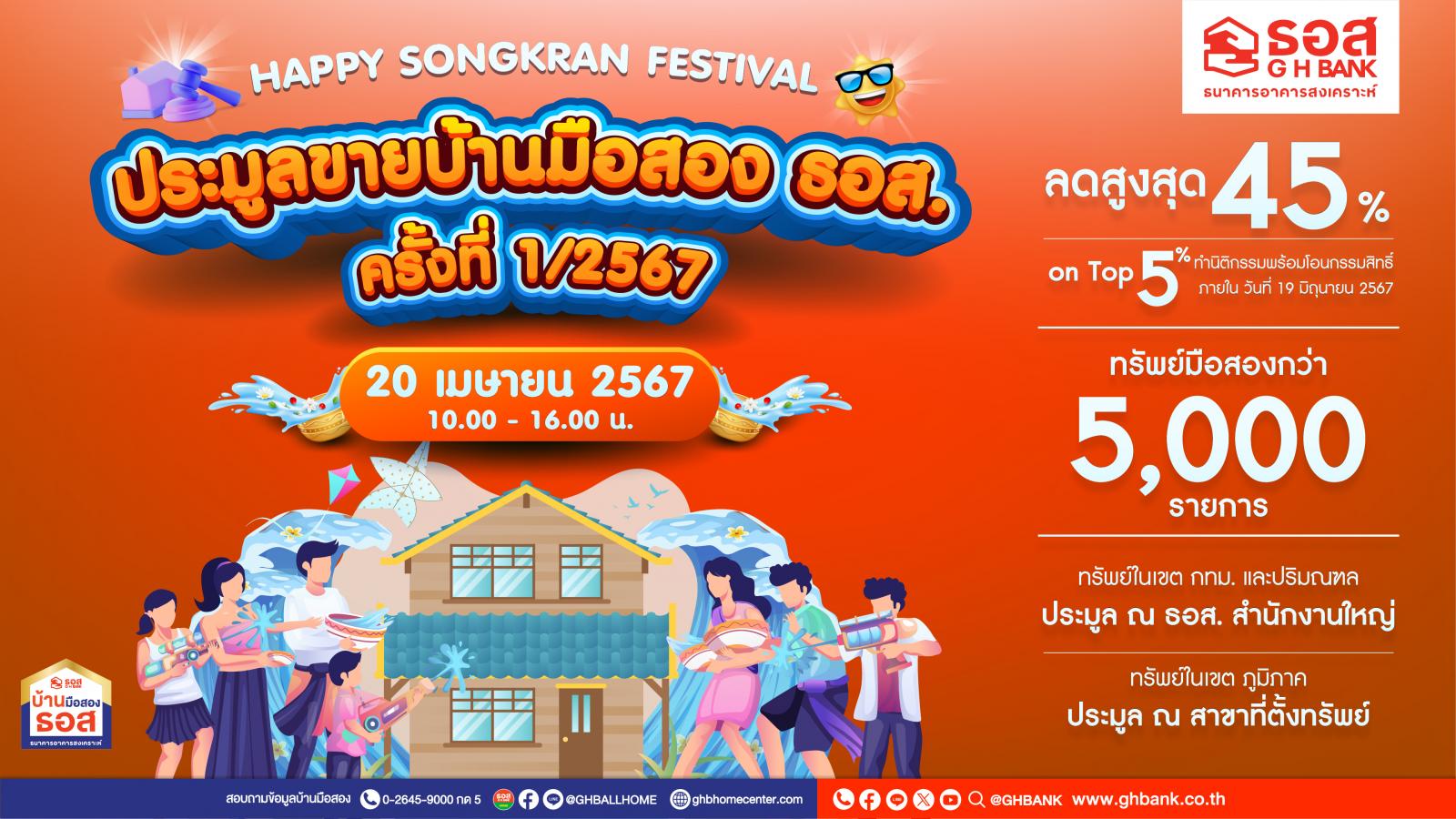 ธนาคารอาคารสงเคราะห์ เพิ่มทางเลือกให้คนอยากมีบ้าน จัดงานประมูลขายบ้านมือสอง ธอส. ประจำปี ครั้งที่ 1/2567 ในวันเสาร์ที่ 20 เมษายน 2567 เวลา 10.00 - 16.00 น. พบกับบ้านมือสอง ธอส. ทำเลดี มากกว่า 5,000 รายการทั่วประเทศ มาประมูลขายในราคาลดพิเศษสูงสุดถึง 45% On top อีก 5% (*เงื่อนไขเป็นไปตามที่ธนาคารกำหนด) เปิดประมูลในราคาต่ำสุดเพียง 55,000 บาท เท่านั้น พิเศษ!! ผู้ชนะการประมูลสามารถขอสินเชื่อบ้านอัตราดอกเบี้ยต่ำสุด นานสูงสุด 24 เดือน* ผู้ที่สนใจสามารถลงทะเบียนเข้าร่วมประมูลล่วงหน้าผ่านช่องทางออนไลน์ https://crm.ghbank.co.th/survey/bitnpa ตั้งแต่วันนี้ - 18 เมษายน 2567