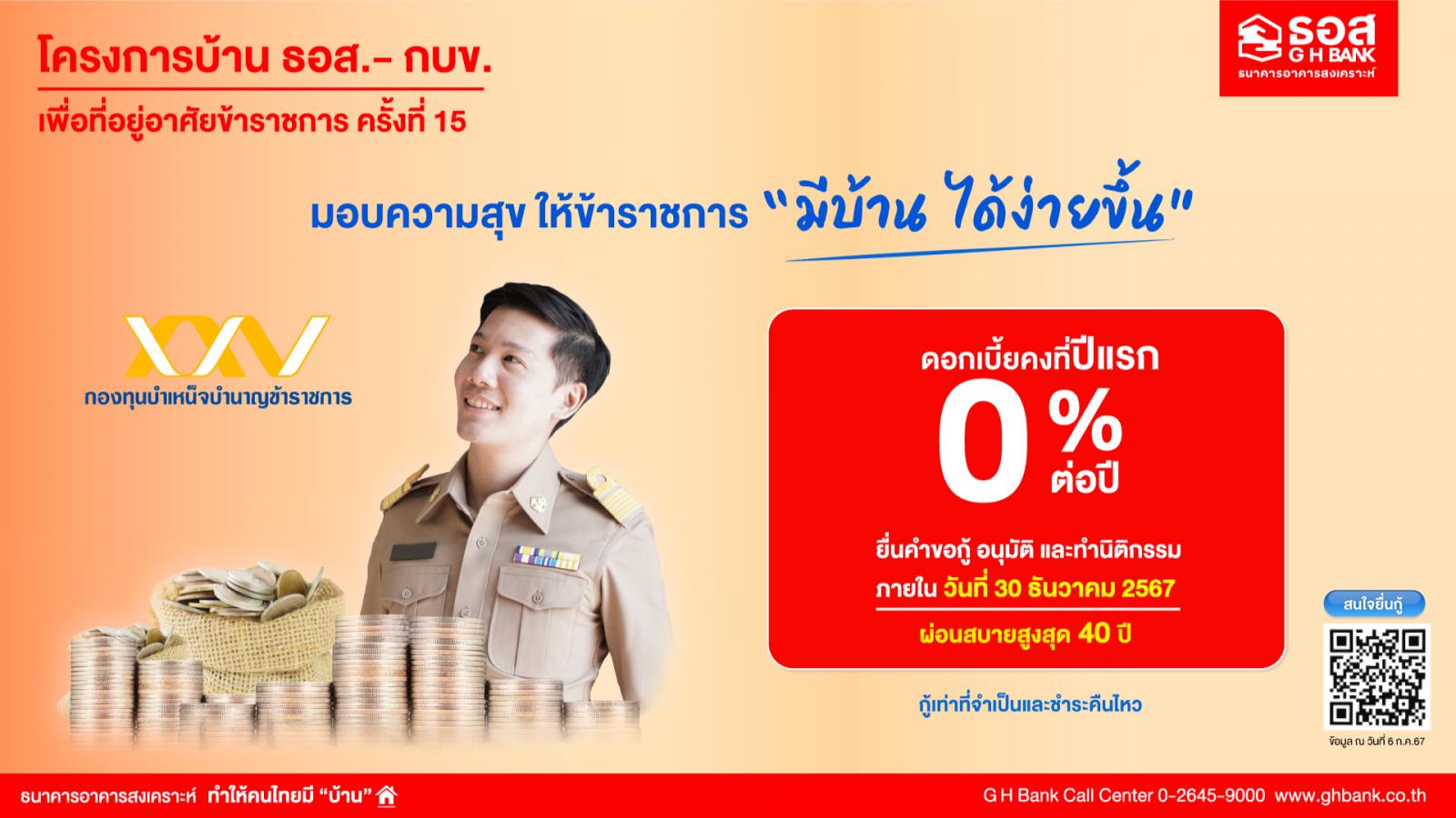 (3) โครงการ Life Begins with GHB : สำหรับสมาชิกสภา/สมาคม วิชาชีพ สังกัดกระทรวงสาธารณสุข ที่ต้องการกู้เพื่อซื้อ ปลูกสร้าง ไถ่ถอนจากสถาบันการเงินอื่น (รีไฟแนนซ์) ซื้ออุปกรณ์หรือสิ่งอำนวยความสะดวกเกี่ยวกับที่อยู่อาศัย และชำระหนี้เกี่ยวกับที่อยู่อาศัย อัตราดอกเบี้ยปีที่ 1 เท่ากับ 1.99% ต่อปี, ปีที่ 2 เท่ากับ 2.99% ต่อปี, ปีที่ 3 เท่ากับ 3.99% ต่อปี (อัตราเฉลี่ยอัตราดอกเบี้ย 3 ปีแรก เท่ากับ 2.99% ต่อปี) และปีที่ 4 จนถึงตลอดอายุสัญญา กรณีลูกค้าสวัสดิการ เท่ากับ MRR-1.00% ต่อปี หรือ เท่ากับ 5.545% ต่อปี, กรณีลูกค้ารายย่อย เท่ากับ MRR-0.50% ต่อปี หรือ เท่ากับ 6.045% ต่อปี และกรณีซื้ออุปกรณ์/ชำระหนี้เกี่ยวกับที่อยู่อาศัย เท่ากับ MRR หรือ เท่ากับ 6.545% ต่อปี กรณีกู้ 1 ล้านบาท ระยะเวลาผ่อนชำระนาน 40 ปี ผ่อนชำระปีแรกเริ่มต้นเพียงเดือนละ 3,300 บาท เท่านั้น! ยื่นกู้และทำนิติกรรมภายในวันที่ 30 ธันวาคม 2567 และยังได้รับสิทธิ์ออมเงินที่ให้ผลตอบแทนสูง กับ “เงินฝากออมทรัพย์ GHB Welfare Savings” อัตราดอกเบี้ยสูงถึง 1.85% ต่อปี สำหรับผู้ที่มีวงเงินฝากคงเหลือไม่เกิน 10 ล้านบาท โดยผู้ที่สนใจสามารถเปิดบัญชีเงินฝาก (ขั้นต่ำ 500 บาท ขึ้นไป) ที่สาขาของธนาคาร จนถึงวันที่ 30 ธันวาคม 2567 หรือจนกว่าจะเต็มกรอบวงเงิน พิเศษ!! ลูกค้าจะได้รับดอกเบี้ยเงินฝากทุก ๆ วันที่ 15 ของเดือน และไม่เสียภาษีดอกเบี้ยเงินฝากอีกด้วย