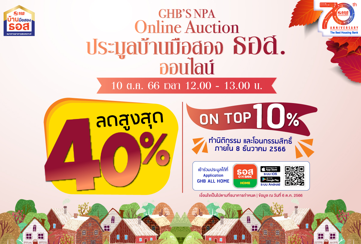 ธนาคารอาคารสงเคราะห์ (ธอส.) เอาใจคนอยากมีบ้าน ต้อนรับไตรมาสสุดท้ายของปี 2566 โดยไม่ต้องเดินทางมาสาขา ด้วยการจัดงาน “10.10 GHB’S NPA Online Auction ประมูลบ้านมือสอง ธอส. ออนไลน์” พร้อมกันทั่วประเทศ ในวันอังคารที่ 10 ตุลาคม 2566 ระหว่างเวลา 12.00-13.00 น. ผ่าน Application : GHB ALL HOME โดยนำทรัพย์เด่นกว่า 1,000 รายการทั่วประเทศ ทั้งประเภทบ้านเดี่ยว บ้านแฝด ทาวน์เฮ้าส์ ห้องชุด อาคารพาณิชย์ และที่ดินเปล่า มาจำหน่ายในราคาพิเศษด้วยส่วนลดสูงสุดถึง 40% ของราคาประเมินในปัจจุบัน และหากรับโอนกรรมสิทธิ์ภายในวันที่ 8 ธันวาคม 2566 จะได้รับส่วนลด On Top เพิ่มอีก 10% ของราคาที่ปิดประมูล แบ่งเป็น ทรัพย์ในพื้นที่กรุงเทพฯ และปริมณฑล จำนวน 497 รายการ โดยมีรายการที่น่าสนใจ อาทิ ทรัพย์ประเภทบ้านเดี่ยว 2 ชั้น ขนาดเนื้อที่ 84.3 ตารางวา ในโครงการหมู่บ้านมณีรินทร์เลคแอนด์พาร์ค อ.เมืองปทุมธานี จ.ปทุมธานี มีราคาเปิดประมูลเริ่มต้นที่ 3.6 ล้านบาท ซึ่งเป็นทรัพย์ที่อยู่ใกล้แหล่งอำนวยความสะดวกมากมาย และเดินทางได้อย่างคล่องตัว