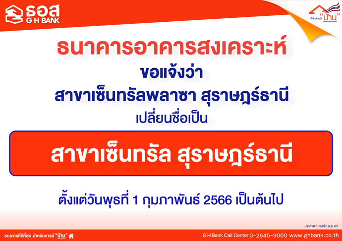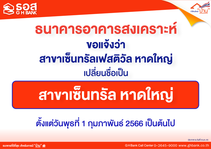 หน้าแรก หน้าแรก ศูนย์ข่าวสาร ข่าวประชาสัมพันธ์ ธอส.ขอแจ้งเปลี่ยนชื่อสาขาที่ตั้งอยู่บนศูนย์การค้าเซ็นทรัล ศูนย์ข่าวสาร คัดลอกลิ้งค์เก็บไว้ที่คลิปบอร์ดแล้ว ธอส.ขอแจ้งเปลี่ยนชื่อสาขาที่ตั้งอยู่บนศูนย์การค้าเซ็นทรัล ข่าวประชาสัมพันธ์ 6 ธันวาคม 2565 คัดลอกลิ้งค์เก็บไว้ที่คลิปบอร์ดแล้ว