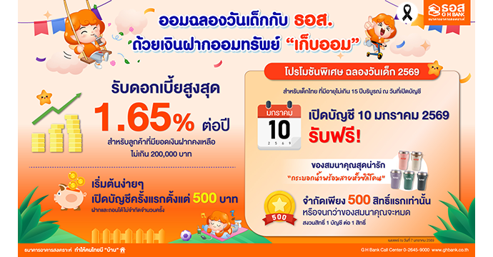 ธนาคารอาคารสงเคราะห์ (ธอส.) ร่วมส่งเสริมวินัยการออมเนื่องในเทศกาลวันเด็กแห่งชาติ ประจำปี 2569 สำหรับเด็กไทยที่มีอายุไม่เกิน 15 ปีบริบูรณ์ ออมเงินกับเงินฝากออมทรัพย์ “เก็บออม” จะได้รับผลตอบแทนจากอัตราดอกเบี้ยสูงถึง 1.65% ต่อปี (สำหรับลูกค้าที่มียอดเงินฝากคงเหลือไม่เกิน 200,000 บาท) โดยเปิดบัญชีครั้งแรกตั้งแต่ 500 บาทขึ้นไป พร้อมสิทธิพิเศษเฉพาะผู้เปิดบัญชีในวันเสาร์ที่ 10 มกราคม 2569 รับฟรีกระบอกน้ำพร้อมสายหิ้วซิลิโคนสุดน่ารักจำนวน 500 สิทธิ์ (1 บัญชี ต่อ 1 สิทธิ์) หรือจนกว่าของสมนาคุณจะหมด (เงื่อนไขเป็นไปตามที่ธนาคารกำหนด) โดยผู้ปกครองพาน้อง ๆ มาสร้างอนาคตทางการเงินที่มั่นคงไปกับ ธอส. ได้ง่าย ๆ ซึ่งผู้ฝากสามารถฝากและถอนได้ไม่จำกัดจำนวนครั้ง และจะได้รับดอกเบี้ยเงินฝากปีละ 2 ครั้ง ในวันที่ 29 มิถุนายน และ วันที่ 29 ธันวาคม สอบถามรายละเอียดเพิ่มเติมได้ที่ G H Bank Call Center โทร 0-2645-9000 และติดตามข่าวสารของธนาคารได้ที่ G H Bank Social Media ทุกช่องทาง