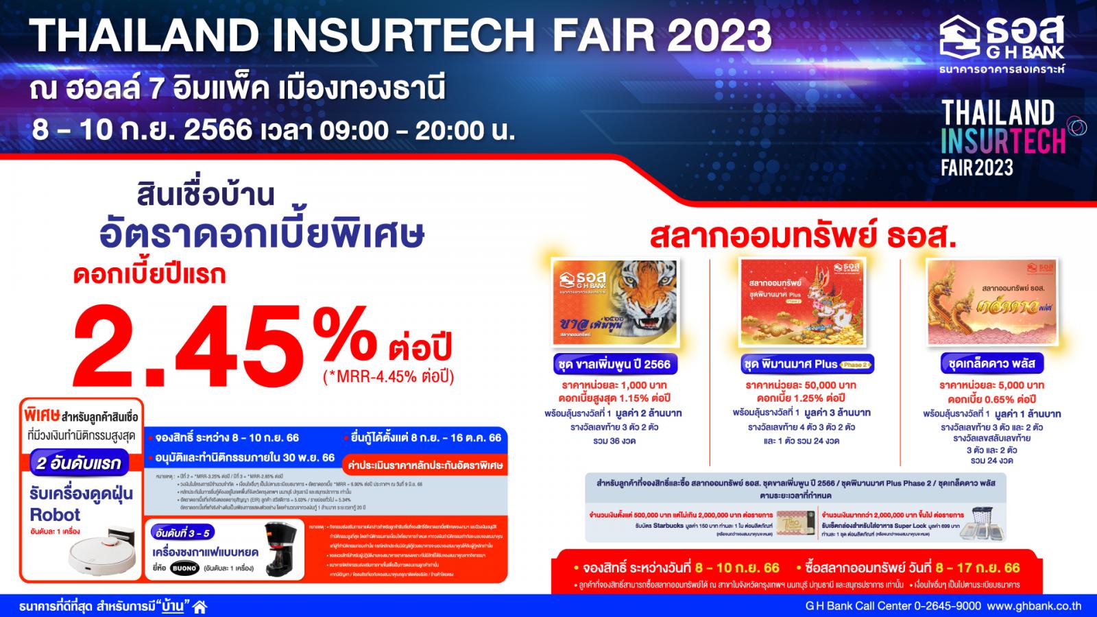 ธนาคารอาคารสงเคราะห์ (ธอส.) จัดโปรโมชันร่วมงานมหกรรมประกันภัยสุดยิ่งใหญ่แห่งปี “THAILAND INSURTECH FAIR 2023” เพิ่มโอกาสให้คนไทยได้เข้าถึงผลิตภัณฑ์ทางการเงินของธนาคารมากขึ้น นำโดย สินเชื่อบ้านอัตราดอกเบี้ยพิเศษปีแรกเท่ากับ MRR-4.45% ต่อปี (ปัจจุบันเท่ากับ 2.45% ต่อปี) เฉลี่ย 3 ปีแรกเพียง 3.45% (อัตราดอกเบี้ย MRR ของ ธอส.ในปัจจุบันเท่ากับ 6.90% ต่อปี) ค่าประเมินราคาหลักประกันอัตราพิเศษ ผ่อนชำระนานสูงสุดถึง 40 ปี ให้กู้ครอบคลุมทุกวัตถุประสงค์หลัก อาทิ ซื้อบ้าน/คอนโดมิเนียม ปลูกสร้าง และรีไฟแนนซ์ โดยหลักประกันในการยื่นคำขอกู้ต้องอยู่ในพื้นที่จังหวัดกรุงเทพฯ นนทบุรี ปทุมธานี และสมุทรปราการเท่านั้น จองสิทธิ์ภายในงาน ยื่นกู้ตั้งแต่วันที่ 8 กันยายน – 16 ตุลาคม 2566 และทำนิติกรรมภายในวันที่ 30 พฤศจิกายน 2566 พิเศษ!! สำหรับลูกค้าสินเชื่อที่มีวงเงินทำนิติกรรมสูงสุด 5 อันดับแรก รับของสมนาคุณฟรี ดังนี้ วงเงินสูงสุดอันดับที่ 1 - 2 รับเครื่องดูดฝุ่น Robot และอันดับที่ 3 - 5 รับเครื่องชงกาแฟแบบหยดจาก Buono