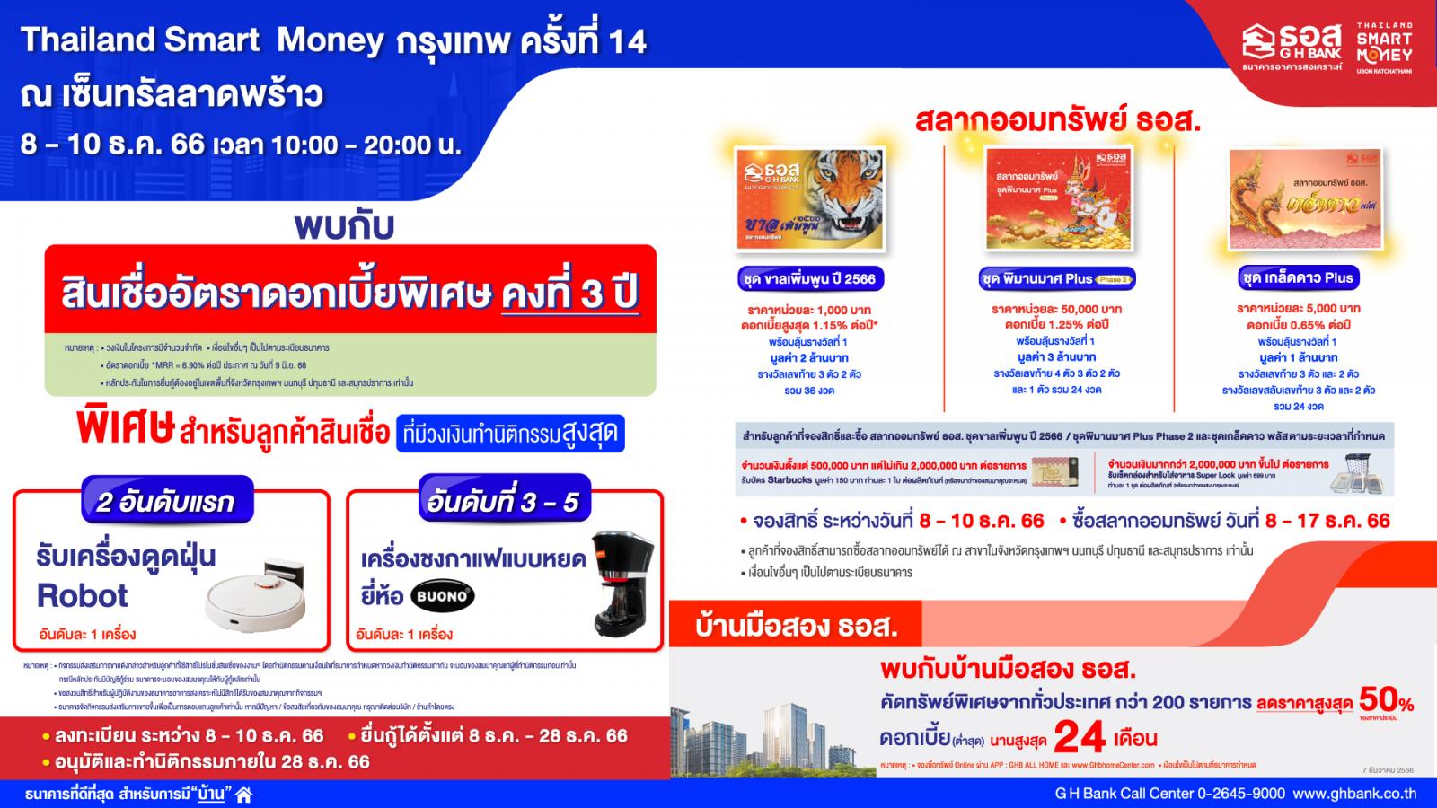 อีกมากมาย โดยงาน Thailand Smart Money กรุงเทพฯ ครั้งที่ 14 มีกำหนดจัดขึ้นระหว่างวันที่ 8-10 ธันวาคม 2566 ณ BCC Hall ชั้น 5 ศูนย์การค้าเซ็นทรัลลาดพร้าว สอบถามรายละเอียดเพิ่มเติมได้ที่ ธอส.ทุกสาขาทั่วประเทศ G H Bank Call Center โทร 0-2645-9000 หรือ Facebook Fanpage ธนาคารอาคารสงเคราะห์ และติดตามข่าวสารของธนาคารได้ที่ Mobile Application : GHB ALL GEN และ www.ghbank.co.th