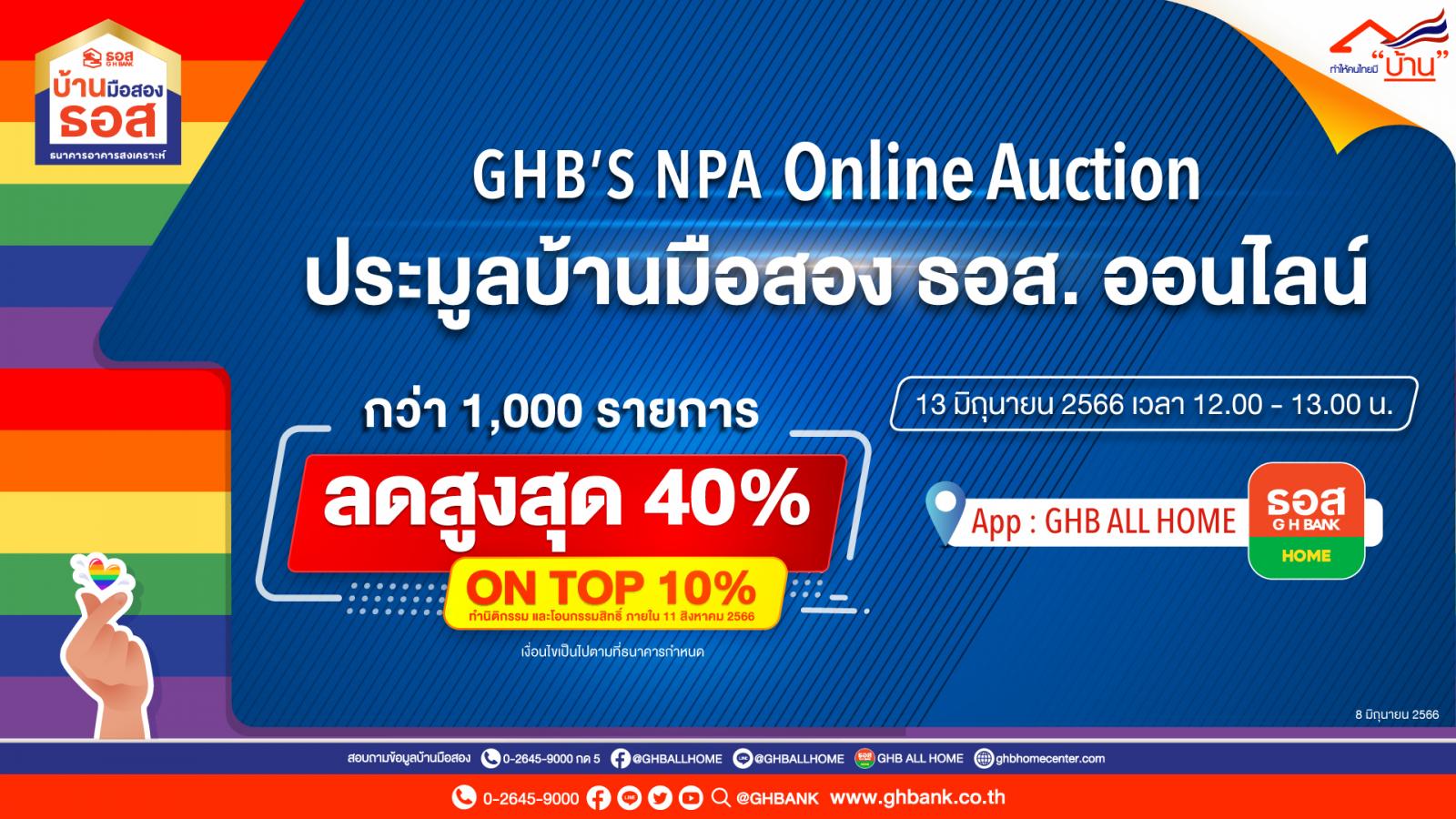 สำหรับผู้ที่สนใจสามารถเข้าชมทรัพย์จริงก่อนการเข้าร่วมประมูล หรือรับชมภาพทรัพย์ได้ทาง www.ghbhomecenter.com หรือ Application : GHB ALL HOME และเข้าร่วมประมูลได้โดยการชำระเงินประกันการเข้าร่วมประมูลออนไลน์จำนวน 5,000 บาทต่อ 1 รายการทรัพย์ ตั้งแต่วันนี้ถึงวันที่ 9 มิถุนายน 2566 เวลา 22.00 น. โดยเข้า Application : GHB ALL HOME เลือกเมนู “ประมูลออนไลน์” และเลือกทรัพย์ที่ต้องการ ก่อนชำระเงินประกันผ่านทาง Application : GHB ALL GEN หรือ QR Code ทั้งนี้หากลูกค้าชนะการประมูลและทำสัญญาจะซื้อจะขายภายในเวลาที่กำหนด ธนาคารยังมี “ผลิตภัณฑ์สินเชื่อสำหรับซื้อทรัพย์ NPA พร้อมขายของธนาคาร” รองรับสำหรับผู้ซื้อทรัพย์ โดยเงื่อนไขเป็นไปตามหลักเกณฑ์ที่ธนาคารกำหนด พิเศษ!! ของสมนาคุณอีกมากมายสำหรับลูกค้าที่จองซื้อบ้านมือสอง ธอส. สอบถามข้อมูลเพิ่มเติมได้ที่ G H Bank Call Center โทร.0-2645-9000 กด 5 หรือ Facebook Fanpage ธนาคารอาคารสงเคราะห์ หรือดูข้อมูลบ้านมือสอง ธอส. ได้ที่ www.ghbhomecenter.com, Mobile Application : GHB ALL HOME และ Line Official Account : @GHBALLHOME