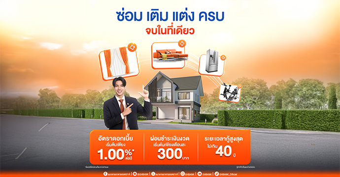 ธนาคารอาคารสงเคราะห์ (ธอส.) ร่วมกระตุ้นเศรษฐกิจผ่านการปล่อยสินเชื่อเข้าสู่ระบบ และสนับสนุนคนไทยมีคุณภาพชีวิตที่ดีขึ้น จัดทำสินเชื่อเพื่อต่อเติม ซ่อมแซม ปรับปรุงที่อยู่อาศัย ซื้ออุปกรณ์ หรือสิ่งอำนวยความสะดวกภายในบ้าน อัตราดอกเบี้ยเริ่มต้นเพียง 1.00% ต่อปี ผ่อนสูงสุดนาน 40 ปี ชำระเงินงวดเริ่มต้นเพียงเดือนละ 300 บาทเท่านั้น ประกอบด้วย 1. สินเชื่อซ่อม – แต่ง” และ “สินเชื่อซ่อม – แต่ง Plus ให้กู้รวมวงเงินสูงสุดไม่เกิน 300,000 บาทต่อราย อัตราดอกเบี้ยเริ่มต้นเพียง 1.00% ต่อปี สำหรับวงเงิน 100,000 บาทแรก ระยะเวลาการกู้นานสูงสุด 5 ปี 2. สินเชื่อบ้านเติมเต็ม อัตราดอกเบี้ยปีแรก 2.60% ต่อปี3. สินเชื่อพร้อมใช้ อัตราดอกเบี้ย 3 ปีแรกเพียง 3.80% ต่อปี และ 4. สินเชื่อบ้านเพิ่มสุข อัตราดอกเบี้ย 5 ปีแรก 4.60% ต่อปี ยื่นขอกู้ได้แล้วตั้งแต่วันนี้เป็นต้นไป ณ ธอส. ทุกสาขาทั่วประเทศ
