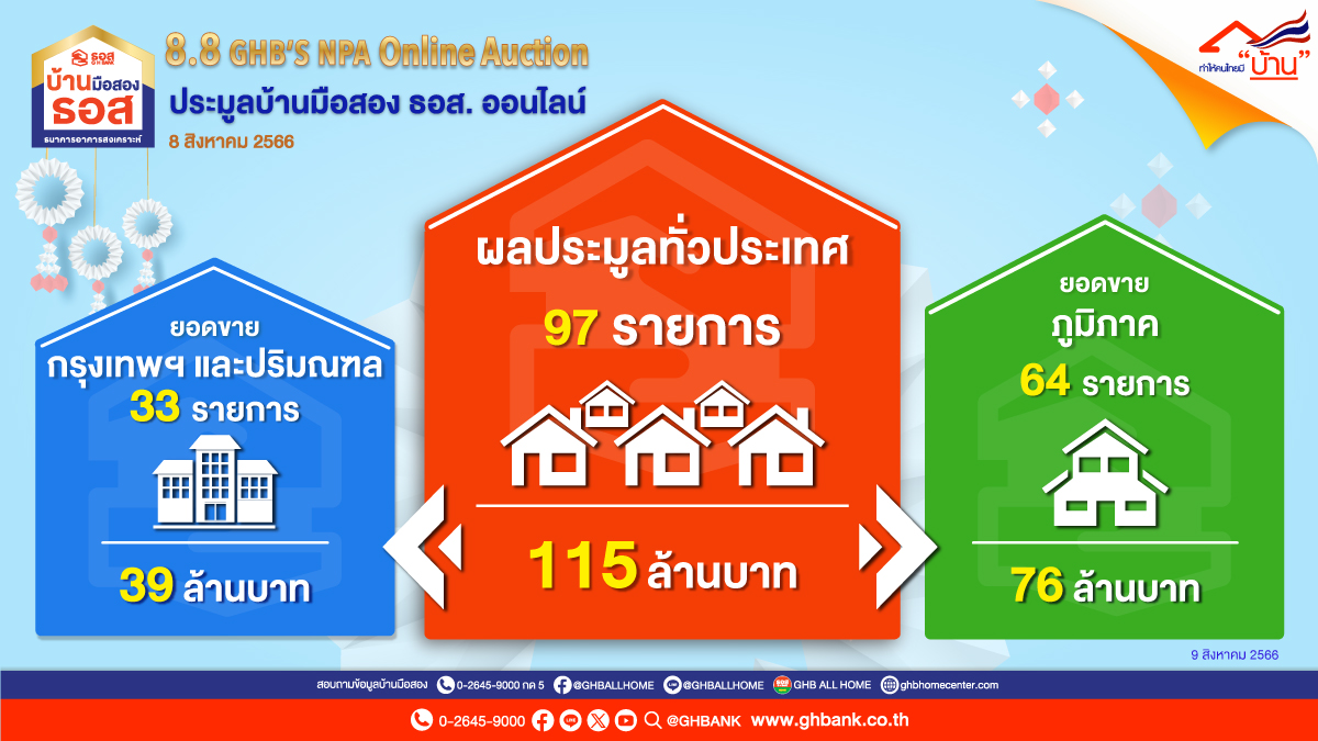 ธนาคารอาคารสงเคราะห์ (ธอส.) รายงานผลการประมูลบ้านมือสอง ธอส. ออนไลน์ 8.8 GHB’s NPA Online Auction ผ่าน Application : GHB ALL HOME จัดขึ้นวานนี้ (8 สิงหาคม 2566) พร้อมกันทั่วประเทศ ระหว่างเวลา 12.00 - 13.00 น. โดยภายในระยะเวลาประมูลเพียง 1 ชั่วโมง สามารถจำหน่ายทรัพย์ NPA ได้จำนวนทั้งสิ้น 97 รายการ คิดเป็นมูลค่าที่จำหน่ายได้รวม 115 ล้านบาท แบ่งเป็นทรัพย์ที่ตั้งอยู่ในพื้นที่กรุงเทพฯ และปริมณฑล จำนวน 33 รายการ คิดเป็นมูลค่า 39 ล้านบาท และทรัพย์ในส่วนภูมิภาค จำนวน 64 รายการ คิดเป็นมูลค่า 76 ล้านบาท โดยทรัพย์ที่ประมูลขายได้ในราคาสูงสุด ได้แก่ ทรัพย์ประเภทบ้านเดี่ยว 2 ชั้น ขนาดเนื้อที่ 130.1 ตารางวา ใน อ.เมืองอุบลราชธานี จ.อุบลราชธานี สามารถจำหน่ายได้ในราคา 2.9 ล้านบาท เนื่องจากเป็นทรัพย์ที่มีพื้นที่ใช้สอยจำนวนมาก เหมาะแก่การอยู่อาศัยเป็นอย่างมาก ส่วนทรัพย์ที่ประมูลขายได้ในราคาต่ำสุด ได้แก่ ทรัพย์ประเภทห้องชุด (คอนโดมิเนียม) ขนาดเนื้อที่ 25.84 ตารางเมตร ในเขตบางเขน กรุงเทพฯ จำหน่ายได้ในราคา 1.7 แสนบาท เท่านั้น