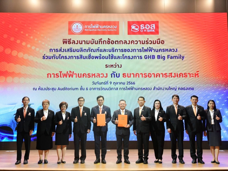 วันนี้ (9 ตุลาคม 2566) นายจาตุรงค์ สุริยาศศิน รองผู้ว่าการ MEA หรือการไฟฟ้านครหลวง พร้อมด้วย นายวิทยา แสนภักดี รองกรรมการผู้จัดการ กลุ่มงานการตลาด ธนาคารอาคารสงเคราะห์ (ธอส.) ร่วมพิธีลงนามบันทึกข้อตกลงความร่วมมือการส่งเสริมผลิตภัณฑ์ และบริการของการไฟฟ้านครหลวง ร่วมกับโครงการสินเชื่อพร้อมใช้ และโครงการ GHB Big Family ระหว่าง MEA และ ธอส. ณ ห้อง Auditorium ชั้น 6 อาคารวัฒนวิภาส การไฟฟ้านครหลวง สำนักงานใหญ่ คลองเตย
