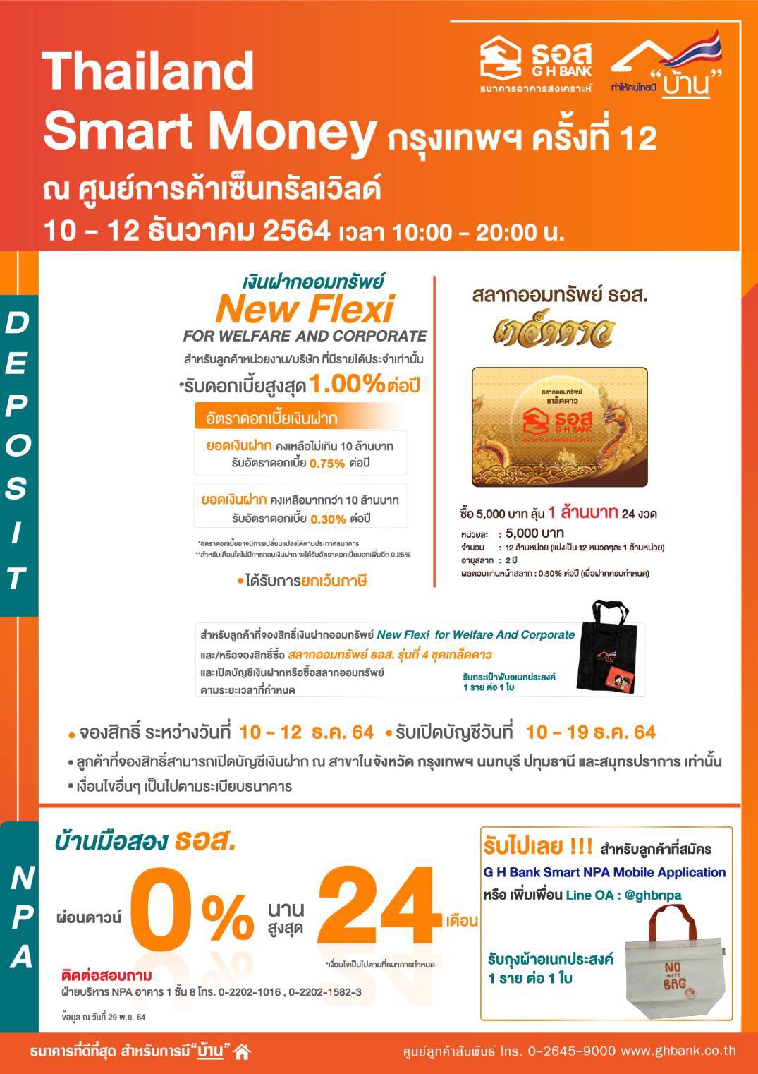 3.ทรัพย์ NPA หรือ บ้านมือสอง ธนาคารได้เตรียมเจ้าหน้าที่ผู้เชี่ยวชาญไว้ให้คำปรึกษาทุกเรื่องบ้านมือสอง “ซื้อบ้านได้ง่ายแค่ปลายนิ้ว” พร้อมนำทรัพย์ดี คุณภาพเด่น จำนวน 40 รายการ จากจำนวนทรัพย์ที่นำออกประมูลกว่า 3,500 รายการ มาจัดแสดงในงานก่อนที่จะนำออกประมูลขายในงานประมูลบ้านมือสอง ธอส. ออนไลน์ (Full moon full sale) ในวันที่ 19 ธันวาคม 2564 และลูกค้าสามารถเลือกซื้อทรัพย์ NPA ในโครงการ Special Price ได้ง่าย ๆ ผ่านApplication G H Bank Smart NPA ทั้งนี้ ลูกค้าที่สนใจผลิตภัณฑ์ของธนาคารสามารถจองสิทธิ์ใช้บริการและขอรับคำปรึกษาจากเจ้าหน้าที่ของ ธอส.ได้ที่งาน “Thailand Smart Money 2021 กรุงเทพฯ ครั้งที่ 12” ซึ่งจะจัดขึ้นระหว่างวันที่ 10-12 ธันวาคม 2564 ณ ศูนย์การค้าเซ็นทรัลเวิลด์ สอบถามรายละเอียดเพิ่มเติมได้ที่ ศูนย์ลูกค้าสัมพันธ์ (Call Center) โทร 0-2645-9000 หรือ www.ghbank.co.th และ Facebook Fanpage ธนาคารอาคารสงเคราะห์