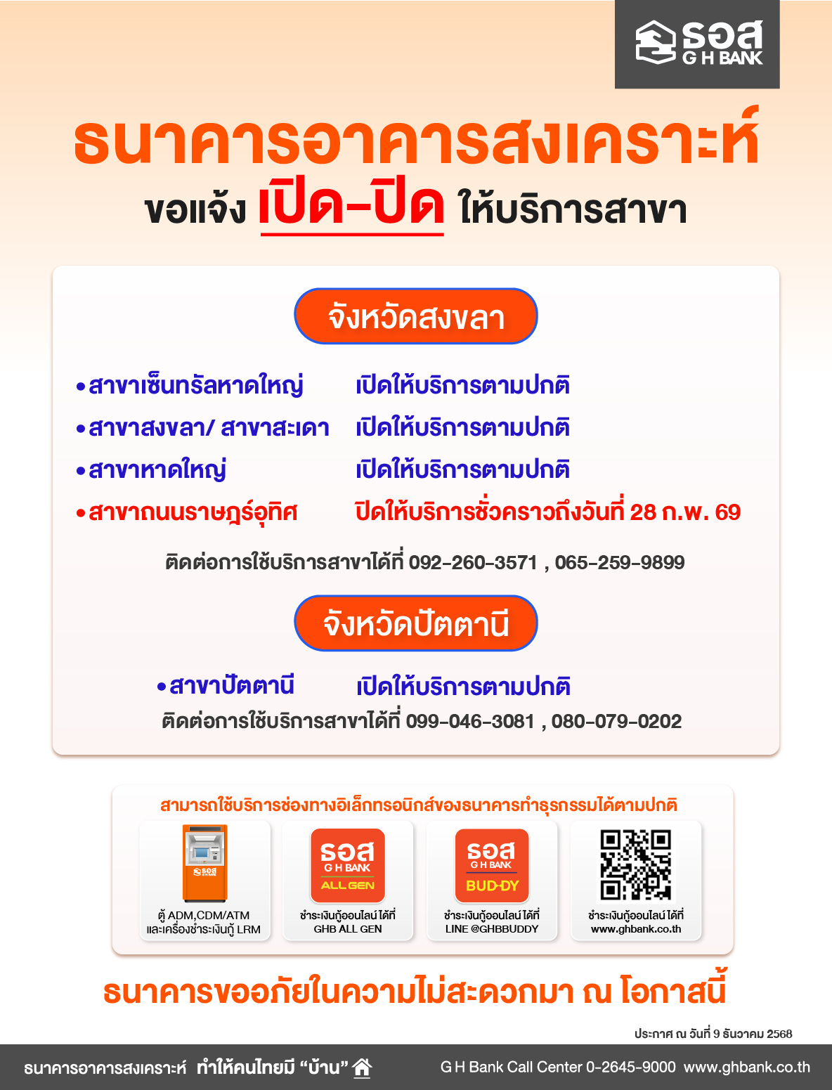 หน้าแรก หน้าแรก ศูนย์ข่าวสาร ข่าวประชาสัมพันธ์ แจ้งการเปิด-ปิด ให้บริการสาขาจังหวัดสงขลาและจังหวัดปัตตานี ศูนย์ข่าวสาร คัดลอกลิ้งค์เก็บไว้ที่คลิปบอร์ดแล้ว แจ้งการเปิด-ปิด ให้บริการสาขาจังหวัดสงขลาและจังหวัดปัตตานี ข่าวประชาสัมพันธ์ 9 ธันวาคม 2568 คัดลอกลิ้งค์เก็บไว้ที่คลิปบอร์ดแล้ว