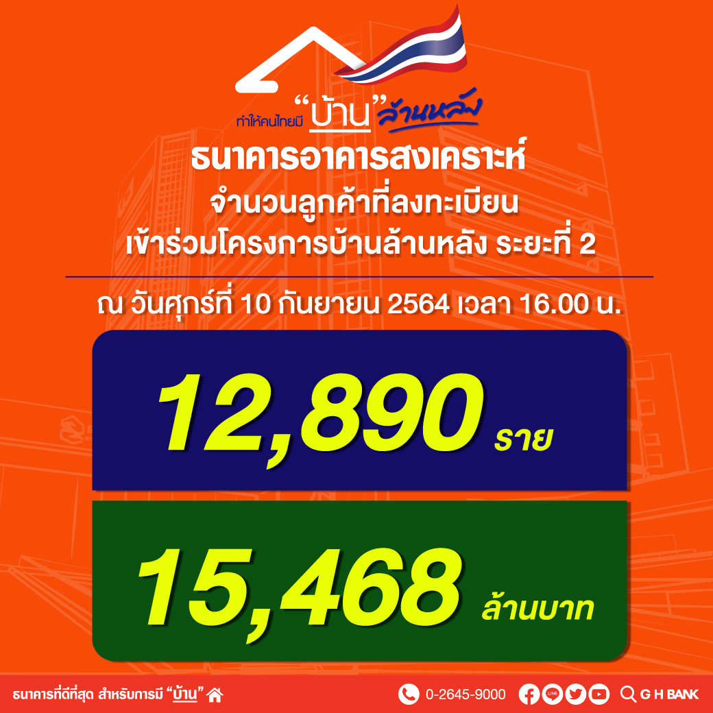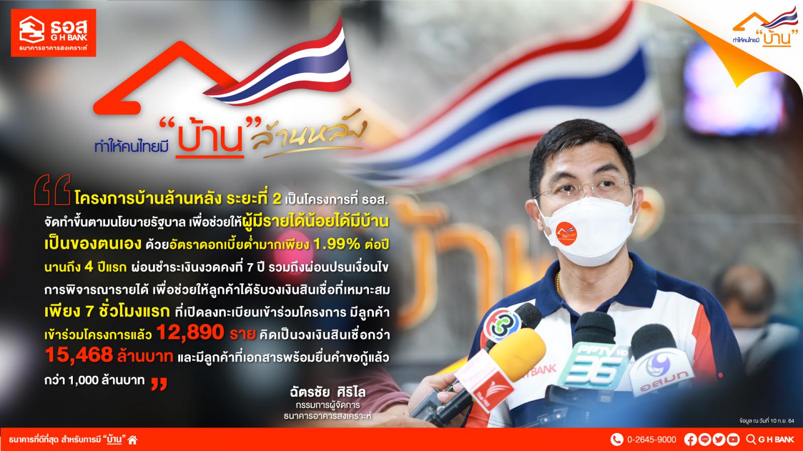 นายฉัตรชัย ศิริไล กรรมการผู้จัดการ ธนาคารอาคารสงเคราะห์ (ธอส.) เปิดเผยว่า หลังจากคณะรัฐมนตรี (ครม.) เมื่อวันที่ 7 กันยายน 2564 มีมติเห็นชอบให้ ธอส. สานต่อโครงการสินเชื่อเพื่อที่อยู่อาศัยแห่งรัฐ (โครงการบ้านล้านหลัง ระยะที่ 2) อัตราดอกเบี้ยคงที่ 1.99% นาน 4 ปีแรก เงินงวดคงที่ 84 งวดแรก ( 7 ปี ) ภายใต้กรอบวงเงินรวม 20,000 ล้านบาท เพื่อช่วยเหลือประชาชน โดยเฉพาะผู้มีรายได้น้อยที่ไม่สามารถเข้าถึงสินเชื่อในระบบสถาบันการเงิน ผู้ที่เริ่มต้นทำงานเพื่อสร้างครอบครัว และผู้สูงอายุ ให้มีที่อาศัยเป็นของตนเองในระดับราคาซื้อ-ขายไม่เกิน 1,200,000 บาท โดยวันนี้ (10 กันยายน 2564) ธอส. ได้เปิดให้ลูกค้าลงทะเบียนผ่าน Mobile Application : GHB ALL เพื่อรับรหัสสำหรับเข้าร่วมโครงการทาง GHB Buddy บน Application Line ตั้งแต่เวลา 9.00 น.เป็นต้นมา ผลปรากฏว่า ณ เวลา 16.00 น. มีลูกค้าให้ความสนใจลงทะเบียนเข้าร่วมโครงการแล้วกว่า 12,890 ราย คิดเป็นวงเงินสินเชื่อ 15,468 ล้านบาท และมีลูกค้าที่เตรียมเอกสารพร้อมยื่นกู้ในวันแรกที่สาขาทั่วประเทศคิดเป็นวงเงินสินเชื่อรวมกว่า 1,000 ล้านบาท