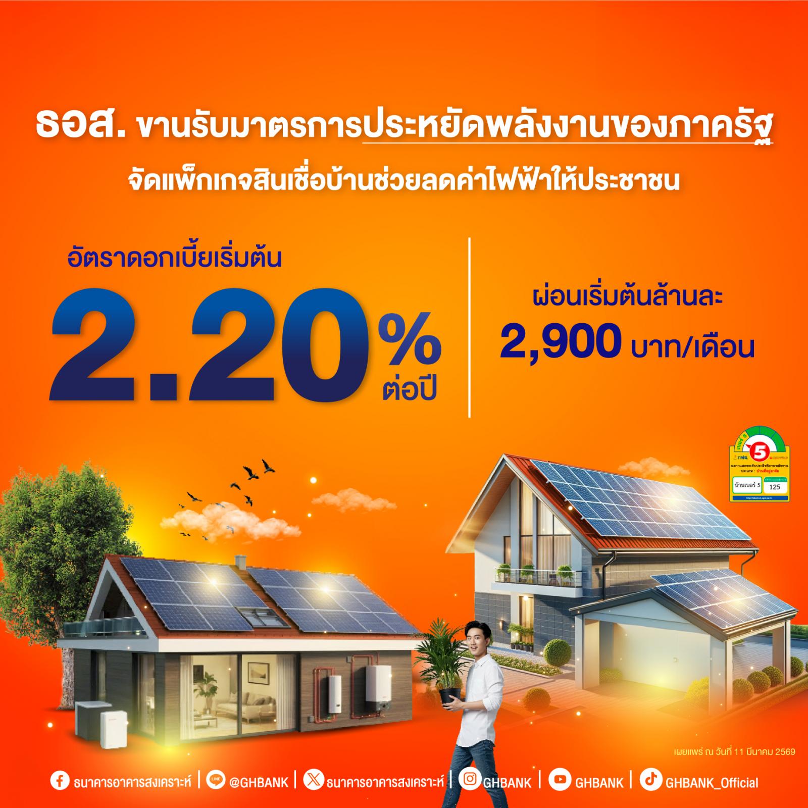 ธนาคารอาคารสงเคราะห์ (ธอส.) ขานรับมาตรการประหยัดพลังงานภาครัฐ รองรับสถานการณ์ราคาพลังงานที่มีความผันผวน พร้อมช่วยลดค่าใช้จ่ายให้กับลูกค้าและประชาชน จัดทำแพ็กเกจรับหน้าร้อน ปี 2569 กับสินเชื่ออัตราดอกเบี้ยพิเศษ ครอบคลุมการซื้อ สร้าง ต่อเติมที่อยู่อาศัยประหยัดพลังงาน และทางเลือกติดตั้ง Solar Roof ช่วยลดค่าไฟฟ้าระยะยาว ผ่อนชำระสบาย เริ่มต้นเพียงล้านละ 2,900 บาทต่อเดือน ประกอบด้วย 1) สินเชื่อบ้านอยู่เย็นเป็นสุข : สำหรับผู้ที่ต้องการซื้อ ปลูกสร้าง ต่อเติม ซ่อมแซม ปรับปรุง และซื้ออุปกรณ์ ฯ ที่เกี่ยวกับระบบพลังงานทดแทน เพื่อให้เป็นที่อยู่อาศัยประหยัดพลังงาน(ECO House) อัตราดอกเบี้ยปีแรกเริ่มต้นเพียง 2.20% ต่อปี ผ่อนชำระเงินงวดเริ่มต้นเพียง 2,900 บาท(2) สินเชื่อบ้านเบอร์ 5 : สำหรับผู้ที่ต้องการซื้อ ปลูกสร้าง และ รีไฟแนนซ์ที่อยู่อาศัยที่ได้รับการรับรองคุณสมบัติบ้านเบอร์ 5 จากการไฟฟ้าฝ่ายผลิตแห่งประเทศไทย (กฟผ.) อัตราดอกเบี้ยคงที่ 2 ปีแรกเริ่มต้นเพียง 2.69% ต่อปี ผ่อนชำระเงินงวดเริ่มต้น 3,200 บาท และ (3) สินเชื่อ Solar Roof : สำหรับลูกค้าสวัสดิการที่หน่วยงานทำข้อตกลงโครงการสวัสดิการเงินกู้ที่อยู่อาศัยประเภทไม่มีเงินฝากกับธนาคาร ที่ต้องการกู้เพิ่มเพื่อติดตั้ง Solar Roof วงเงินกู้สูงสุดไม่เกิน 300,000 บาท และไม่ต้องจดจำนองเพิ่มที่สำนักงานที่ดิน อัตราดอกเบี้ยคงที่ 3 ปีแรก 3.90% ต่อปี ผ่อนชำระเงินงวดเริ่มต้น 1,100 บาท ยื่นขอสินเชื่อได้แล้วตั้งแต่วันนี้เป็นต้นไป ผ่าน Application : GHB ALL GEN และ ธอส. ทุกสาขาทั่วประเทศ