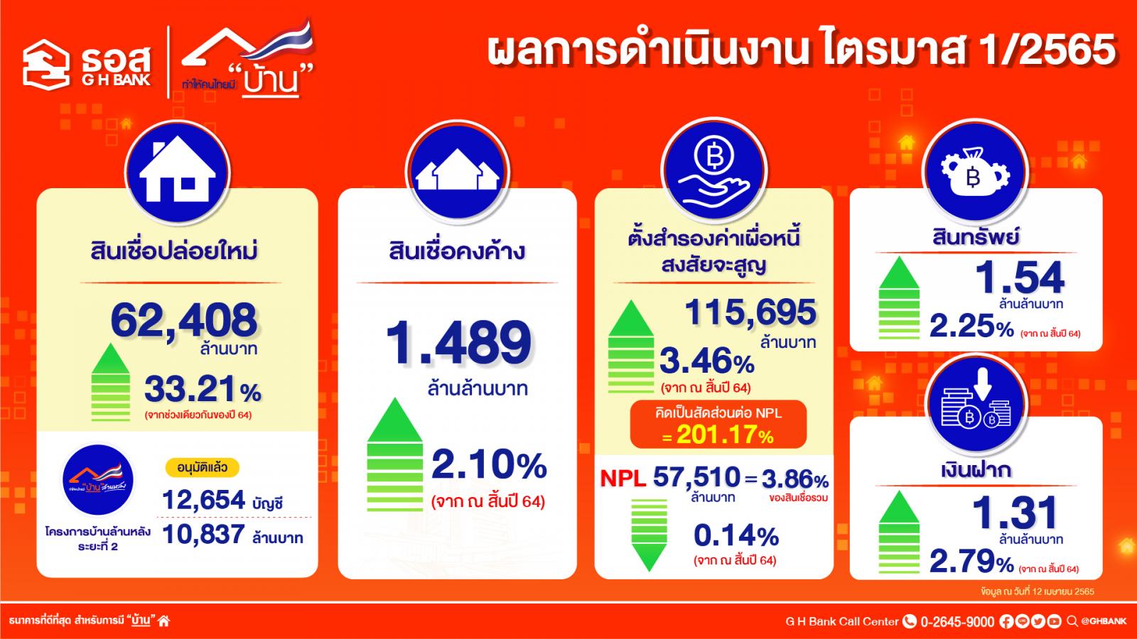 ธนาคารอาคารสงเคราะห์ เผยผลการดำเนินงานไตรมาสแรกปี 2565 ปล่อยสินเชื่อใหม่สร้างโอกาสให้คนไทยมีบ้านตามนโยบายรัฐบาลได้ถึง 62,408 ล้านบาท 50,024 บัญชี เพิ่มขึ้นจากช่วงเดียวกันของปีก่อน 33.21% ทำให้ ณ สิ้นไตรมาสที่ 1/2565 เทียบกับ ณ สิ้นปี 2564 ธนาคารมียอดสินเชื่อคงค้างรวมทั้งสิ้น 1.489 ล้านล้านบาท เพิ่มขึ้น 2.10% สินทรัพย์รวม 1.54 ล้านล้านบาท เพิ่มขึ้น 2.25% เงินฝากรวม 1.31 ล้านล้านบาท เพิ่มขึ้น 2.79% หนี้ที่ไม่ก่อให้เกิดรายได้ (NPL) จำนวน 57,510 ล้านบาท คิดเป็น 3.86% ของยอดสินเชื่อรวม ลดลง 0.14% ด้วยปัจจัยบวกจากนโยบายกระตุ้นเศรษฐกิจของรัฐบาล การผ่อนคลายมาตรการ LTV ของธนาคารแห่งประเทศไทย กำลังซื้อของประชาชนที่เริ่มฟื้นกลับมา และอัตราดอกเบี้ยในระดับต่ำ จูงใจให้ลูกค้าขอสินเชื่อเพื่อซื้อที่อยู่อาศัย คาดถึงสิ้นปี 2565 ยอดปล่อยสินเชื่อใหม่ได้ไม่ต่ำกว่า 270,000 ล้านบาท