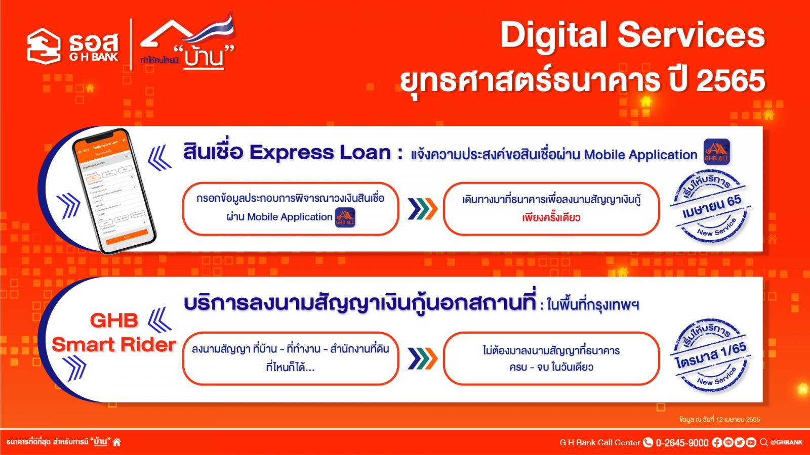 ด้านการปรับกระบวนการให้บริการลูกค้าด้วย Digital Services ตามแผนยุทธศาสตร์ของธนาคารในปี 2565 ล่าสุด ธอส. เตรียมเปิดให้ลูกค้าแจ้งความประสงค์ขอยื่นกู้จากที่ไหนก็ได้ผ่าน Mobile Application : GHB ALL (ปัจจุบันอยู่ระหว่างการพัฒนาเป็น Mobile Application : GHB ALL GEN) ด้วยเมนู “สินเชื่อ Express Loan” เพียงกรอกข้อมูลที่ธนาคารใช้ประกอบการพิจารณาวงเงินสินเชื่อไม่กี่ขั้นตอน และเดินทางมาที่ธนาคารเพื่อลงนามสัญญาเงินกู้เพียงครั้งเดียว โดยจะเริ่มให้บริการลูกค้าอย่างเป็นทางการภายในเดือนเมษายน 2565 นอกจากนี้ในช่วงไตรมาส 1 ของปี 2565 ลูกค้าในพื้นที่กรุงเทพฯ สามารถเลือกลงนามสัญญาเงินกู้นอกสถานที่ทำการของธนาคารด้วยโครงการใหม่ คือ “GHB Smart Rider” การลงนามสัญญาเงินกู้ที่บ้าน ที่ทำงาน ร้านอาหาร ร้านกาแฟ หรือที่สำนักงานที่ดินโดยไม่ต้องเดินทางมาที่ธนาคาร ขณะที่ภายในไตรมาสที่ 2 ของปี 2565 ลูกค้ากลุ่มสวัสดิการที่ทำนิติกรรม ณ สำนักงานที่ดิน และจดทะเบียนจำนองกับธนาคารเรียบร้อยแล้ว สามารถนำโฉนดที่ดินตัวจริงกลับบ้านได้ทันที จากเดิมที่ลูกค้าจะได้รับเป็นสำเนาโฉนดที่ดินจนกว่าจะปิดบัญชีเงินกู้แล้วเท่านั้น ทั้งนี้ ด้วยบริการที่ตรงกับความต้องการของลูกค้า ทำให้ ณ ไตรมาสที่ 1 ของปี 2565 ธนาคารมีจำนวนการทำธุรกรรมผ่าน Mobile Application : GHB ALL คิดเป็นสัดส่วนสูงถึง 70.02% ของจำนวนธุรกรรมทั้งหมด และคาดว่าจะเพิ่มขึ้นเป็นไม่ต่ำกว่า 80% ได้ตามเป้าหมายที่กำหนดไว้ภายในสิ้นปี 2565
