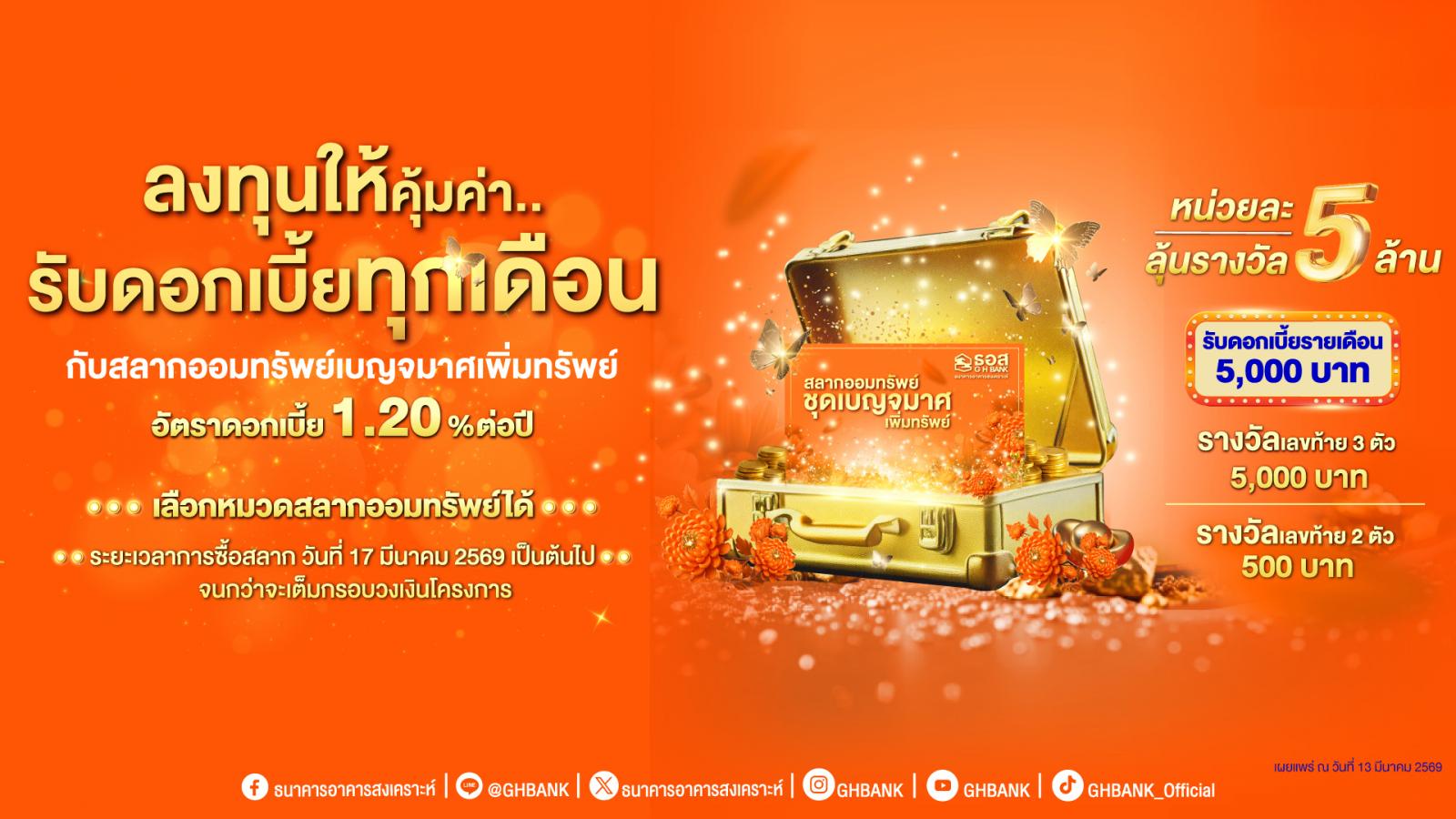 ธนาคารอาคารสงเคราะห์ (ธอส.) สนับสนุนการออม สร้างความมั่นคงในชีวิต เพิ่มทางเลือกการลงทุนที่ให้ผลตอบแทนคุ้มค่า กับ “สลากออมทรัพย์ ธอส. ชุดเบญจมาศเพิ่มทรัพย์” อัตราดอกเบี้ยหน้าสลาก 1.20% ต่อปี โดยรับเป็นรายเดือน เดือนละ 5,000 บาท พร้อมลุ้นรับรางวัลใหญ่ตลอด 12 งวด ผู้ที่สนใจสามารถซื้อสลากได้ตั้งแต่วันที่ 17 มีนาคม 2569 เป็นต้นไป ณ สาขาธนาคารทั่วประเทศ