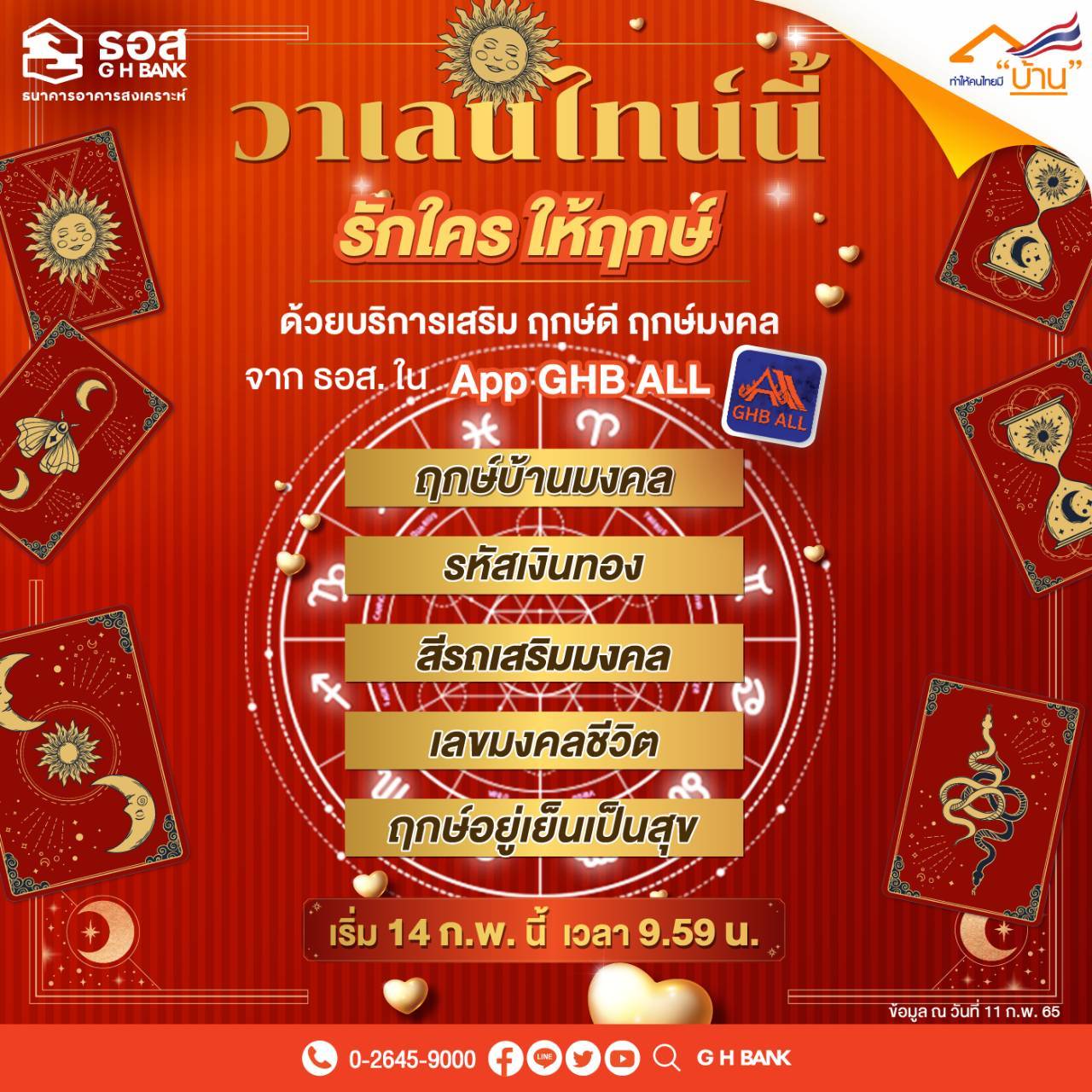 ธนาคารอาคารสงเคราะห์ ส่งความสุขต้อนรับเทศกาลวันวาเลนไทน์นี้ ด้วยบริการเสริมฤกษ์ดี ฤกษ์มงคล จาก ธอส. บน Mobile Application : GHB ALL โดยผู้ใช้บริการสามารถตรวจเช็คฤกษ์งามยามดีเพื่อเสริมความเป็นสิริมงคลในการดำเนินชีวิต ประกอบด้วย ฤกษ์บ้านมงคล ที่สามารถดูฤกษ์ขึ้นบ้านใหม่ การตั้งศาลพระภูมิ ฤกษ์อยู่เย็นเป็นสุข เช็ควันเริ่มต้นชีวิตเกี่ยวกับที่อยู่อาศัย ทั้งวัน/เวลาลงเสาเอก เริ่มก่อสร้าง และต่อเติมบ้าน รหัสเงินทอง ได้ทราบเลขรหัสดูดทรัพย์รับโชคทั้งจากเลข ATM รหัสผ่านโทรศัพท์มือถือ รวมถึง Pin Mobile Banking และรหัสตู้เซฟ เลขมงคลชีวิต ทั้งบ้านเลขที่ หมายเลขโทรศัพท์มือถือ และ สีรถเสริมมงคล ด้วยฤกษ์ออกรถและสีรถที่เหมาะกับตัวคุณ พิเศษ!! ใช้บริการฟรี!! เป็นเวลา 6 เดือน ตั้งแต่วันที่ 14 กุมภาพันธ์ 2565 เป็นต้นไป ดาวน์โหลด Mobile Application : GHB ALL ได้แล้วบนสมาร์ทโฟนทั้งระบบ iOS ที่ App Store ระบบ Android ที่ Google Play และ ระบบ Huawei ที่ HUAWEI AppGallery สอบถามรายละเอียดเพิ่มเติมหรือติดตามข้อมูลข่าวสารของธนาคารได้ที่ ศูนย์ลูกค้าสัมพันธ์ (Call Center) โทร 0-2645-9000 หรือ www.ghbank.co.th และ Facebook Fanpage ธนาคารอาคารสงเคราะห์