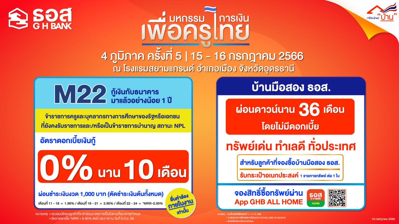 ธนาคารอาคารสงเคราะห์ (ธอส.) นำมาตรการแก้หนี้และผลิตภัณฑ์ทางการเงินเข้าร่วมงานมหกรรมการเงินเพื่อครูไทย 4 ภูมิภาค ครั้งที่ 5 จ.อุดรธานี เพื่อให้ข้าราชการครูและบุคลากรทางการศึกษาใน จ.อุดรธานี ได้รับความช่วยเหลืออย่างครบวงจรและมีคุณภาพชีวิตที่ดีขึ้น นำโดยมาตรการช่วยเหลือลูกค้าปัจจุบันของธนาคาร มาตรการ 22 [M22] สำหรับลูกค้าข้าราชการครูและบุคลากรทางการศึกษาของรัฐหรือเอกชน ที่ยังคงรับราชการและ/หรือเป็นข้าราชการบำนาญ ที่กู้เงินกับธนาคารมาแล้วไม่น้อยกว่า 1 ปี ที่มีสถานะ NPL หรือ สถานะ NPL ที่อยู่ระหว่างการใช้มาตรการ/ปรับโครงสร้างหนี้ ให้ผ่อนเงินงวดต่ำ พร้อมลดอัตราดอกเบี้ยเงินกู้พิเศษ 2 ปี เริ่มต้นเดือนที่ 1-10 ชำระเพียงงวดละ 1,000 บาท อัตราดอกเบี้ย 0% ต่อปี (ตัดชำระเงินต้นทั้งหมด) และภายในงานยังมี บ้านมือสอง ธอส. ทำเลดีทั่วประเทศ พร้อมส่วนลดพิเศษมาจำหน่ายมากกว่า 300 รายการ และรับสิทธิ์ผ่อนดาวน์นานถึง 36 เดือน โดยไม่มีดอกเบี้ย สำหรับผู้ที่สนใจสามารถจองซื้อทรัพย์ออนไลน์ และวางเงินประกัน 5,000 บาท ในวันทำสัญญาจะซื้อจะขาย (เงื่อนไขเป็นไปตามที่ธนาคารกำหนด) ผ่าน Application : GHB ALL HOME พิเศษ!! รับฟรีของสมนาคุณสำหรับลูกค้าที่จองซื้อบ้านมือสอง ธอส. อีกด้วย ทั้งนี้ งานมหกรรมการเงินเพื่อครูไทยฯ ครั้งที่ 5 จัดขึ้นระหว่างวันที่ 15 - 16 กรกฎาคม 2566 ณ โรงแรมสยามแกรนด์ อ.เมือง จ.อุดรธานี สอบถามรายละเอียดเพิ่มเติมได้ที่ ธอส.ทุกสาขาทั่วประเทศ G H Bank Call Center โทร 0-2645-9000 หรือ Facebook Fanpage ธนาคารอาคารสงเคราะห์ และติดตามข่าวสารของธนาคารได้ที่ Mobile Application : GHB ALL GEN และ www.ghbank.co.th