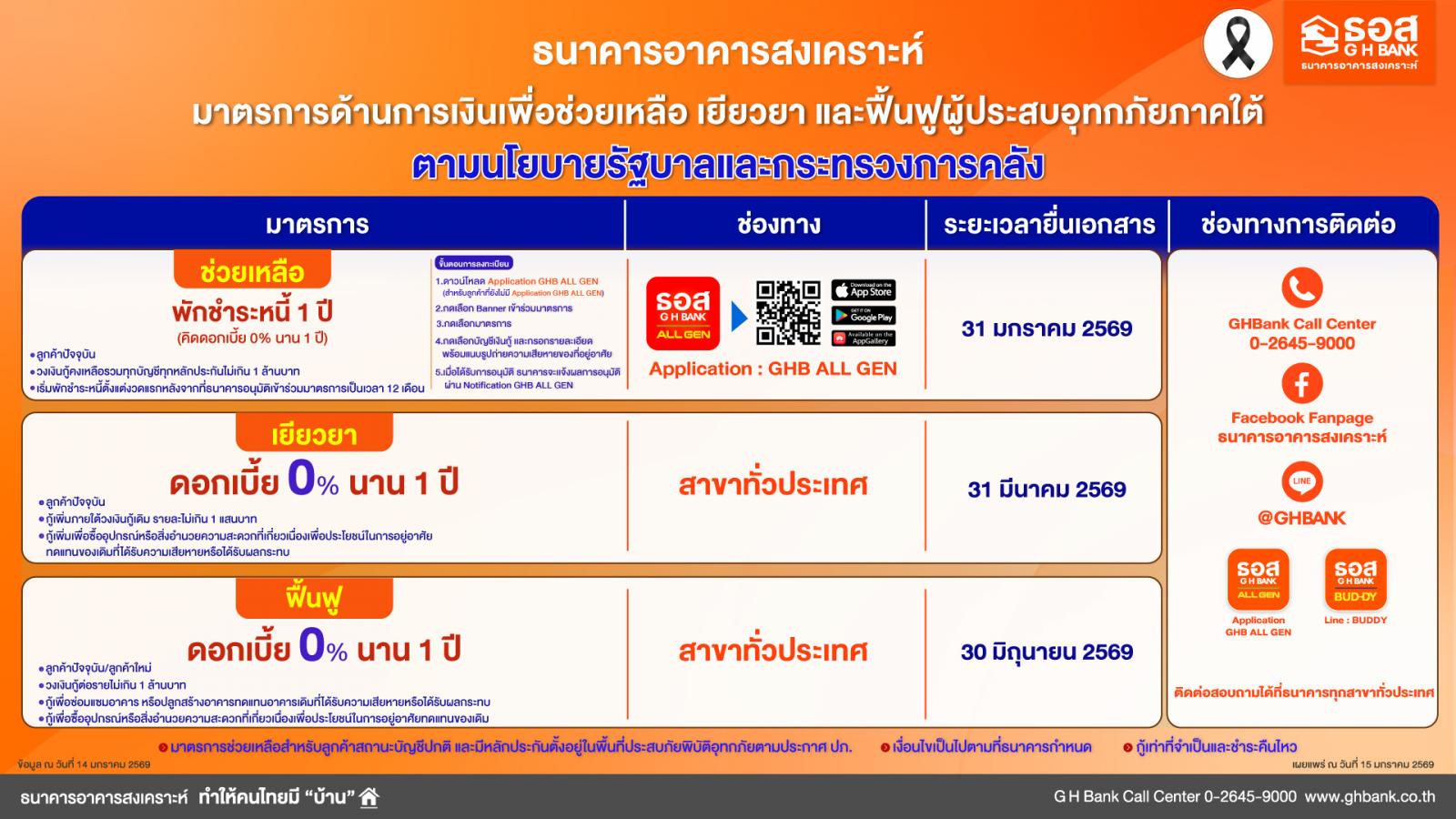 ลูกค้าที่มีความประสงค์เข้าร่วม “มาตรการด้านการเงินเพื่อช่วยเหลือ เยียวยา และฟื้นฟูผู้ประสบอุทกภัยภาคใต้” ในครั้งนี้ ต้องมีสถานะบัญชีปกติ ไม่เป็นหนี้ที่ไม่ก่อให้เกิดรายได้ (NPLs) และมีหลักประกันตั้งอยู่ในพื้นที่ประสบภัยพิบัติอุทกภัยตามประกาศกองอำนวยการกรมป้องกันและบรรเทาสาธารณภัย (ปภ.) ประกอบด้วย 10 จังหวัด 101 อำเภอ 591 ตำบล ได้แก่ ชุมพร นครศรีธรรมราช นราธิวาส ปัตตานี พัทลุง ยะลา ระนอง สงขลา สตูล และสุราษฎร์ธานี สำหรับลูกค้าที่มีความประสงค์เข้าร่วมโครงการช่วยเหลือฯ สามารถกด Banner ใน Application : GHB ALL GEN “มาตรการช่วยเหลือที่อยู่อาศัยที่ได้รับผลกระทบจากอุทกภัยพื้นที่ภาคใต้” บนหน้าจอหลัก เพื่อกรอกข้อมูลส่วนตัวและรายละเอียดความเสียหายของที่อยู่อาศัย พร้อมแนบหลักฐานความเสียหายเพื่อประกอบการพิจารณาให้ความช่วยเหลือ (เงื่อนไขเป็นไปตามที่ธนาคารกำหนด) และธนาคารจะเร่งตรวจสอบข้อมูลและแจ้งผลการพิจารณาอนุมัติเข้าร่วมมาตรการผ่านทางแอปพลิเคชันต่อไป ส่วนลูกค้าที่มีความประสงค์เข้าร่วมโครงการเยียวยาฯ และ โครงการฟื้นฟูฯ สามารถยื่นความประสงค์พร้อมหลักฐานความเสียหายของที่อยู่อาศัยเพื่อประกอบการพิจารณาให้ความช่วยเหลือ ณ สาขาธนาคารทั่วประเทศ สอบถามรายละเอียดเพิ่มเติมได้ที่ G H Bank Call Center โทร 0-2645-9000 และติดตามข่าวสารของธนาคารได้ที่ G H Bank Social Media ทุกช่องทาง