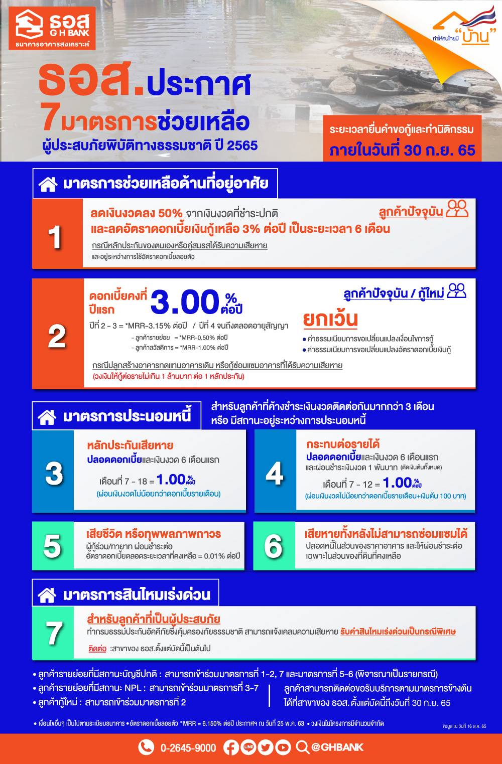 ธนาคารอาคารสงเคราะห์ ขานรับนโยบายรัฐบาล โดยพลเอก ประยุทธ์ จันทร์โอชา นายกรัฐมนตรี และรัฐมนตรีว่าการกระทรวงกลาโหม ในการช่วยเหลือลูกค้าที่ได้รับผลกระทบจาก “พายุมู่หลาน” ที่ส่งผลให้ประเทศไทยมีฝนตกหนักถึงหนักมาก และเกิดน้ำท่วมฉับพลันในบางพื้นที่ของภาคเหนือ ภาคตะวันออกเฉียงเหนือ และภาคตะวันออกด้วย “มาตรการช่วยเหลือผู้ประสบภัยพิบัติทางธรรมชาติปี 2565” 7 มาตรการ ประกอบด้วย 1.ลดเงินงวด 50% จากเงินงวดปกติ และลดอัตราดอกเบี้ยเหลือ 3% ต่อปี เป็นระยะเวลา 6 เดือน 2.ให้กู้เพิ่มหรือกู้ใหม่อัตราดอกเบี้ย 3.00% ต่อปี คงที่ 1 ปีแรก 3.ประนอมหนี้ระยะเวลาไม่เกิน 1 ปี 6 เดือน และคิดอัตราดอกเบี้ย 0% ต่อปี 6 เดือน ไม่ต้องชำระเงินงวด 4.ประนอมหนี้ไม่เกิน 1 ปี คิดอัตราดอกเบี้ย 0% ต่อปี นาน 6 เดือนแรก ผ่อนเงินงวดเพียง 1,000 บาท 5.กรณีเสียชีวิตหรือทุพพลภาพถาวรให้ผ่อนชำระดอกเบี้ย 0.01% ต่อปี 6.ที่อยู่อาศัยเสียหายทั้งหลังซ่อมแซมไม่ได้ ให้ปลอดหนี้ในส่วนของอาคาร และ 7.พิจารณาสินไหมเร่งด่วน (Fast Track) สำหรับลูกค้าที่ทำกรมธรรม์ประกันอัคคีภัย จ่ายตามความเสียหายจริงรวมทุกภัยธรรมชาติสูงสุด 30,000 บาทต่อปี