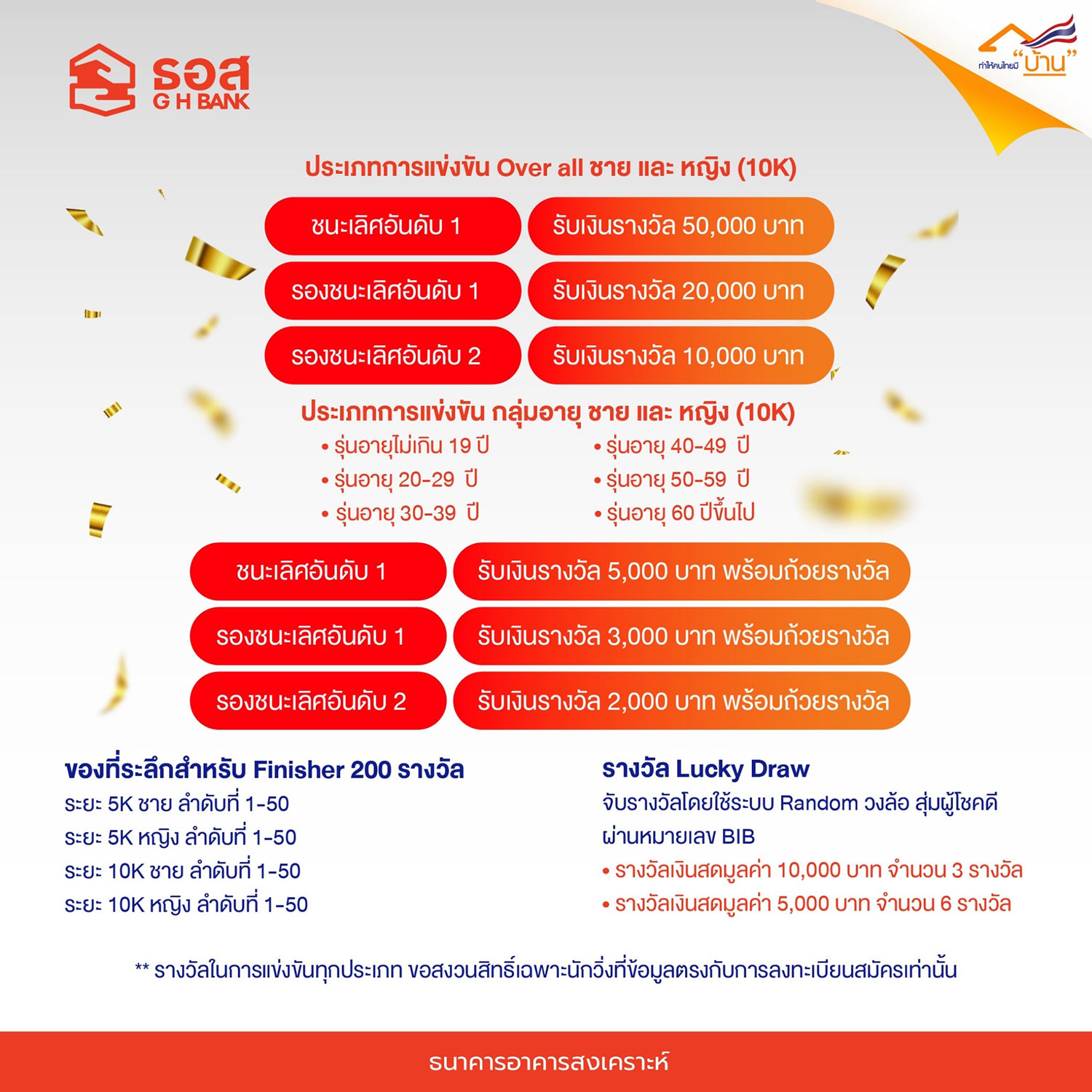 โดยผู้ที่เข้าเส้นชัยทั้งหมดจะได้รับเหรียญรางวัล ส่วนผู้ที่เข้าเส้นชัยลำดับที่ 1-50 ทั้งในประเภทระยะทาง 5 กิโลเมตร และ 10 กิโลเมตร ทั้งชาย/หญิง จะได้รับตุ๊กตา GHB RUN 2022 และยังมีรางวัล Lucky Draw ด้วยการสุ่มจากหมายเลข BIB ลุ้นรับรางวัลเงินสดมูลค่า 10,000 บาท จำนวน 3 รางวัล และรางวัลเงินสดมูลค่า 5,000 บาท จำนวน 6 รางวัลอีกด้วย โดยเปิดรับสมัครทาง https://race.thai.run/ghbrun2022 ตั้งแต่บัดนี้ถึงวันที่ 30 พฤศจิกายน 2565 หรือจนกว่ามีผู้สมัครครบเต็มจำนวน 4,000 คน ทั้งนี้ กิจกรรมดังกล่าวจะจัดขึ้นในวันอาทิตย์ที่ 18 ธันวาคม 2565 ตั้งแต่เวลา 4.00-8.30 น. โดยมีจุด Start และ Finish ที่ธนาคารอาคารสงเคราะห์ สำนักงานใหญ่ พระราม 9 ซึ่งผู้เข้าร่วมงานสามารถจอดรถได้ฟรีที่อาคารจอดรถ Central Rama 9 (ถนนรัชดาภิเษก) รองรับรถได้จำนวน 1,500 คัน 2.ลานจอดรถ อาคาร G-Tower (ถนนพระราม 9) รองรับจำนวน 500 คัน โดยสามารถเข้าจอดรถได้ในเวลา 03.00 - 10.00 น. สอบรายละเอียดเพิ่มเติมได้ที่ G H Bank Call Center โทร 0-2645-9000 หรือ Facebook Fanpage ธนาคารอาคารสงเคราะห์ และติดตามข่าวสารของธนาคารได้ที่ Mobile Application : GHB ALL, Mobile Application : GHB ALL GEN และ www.ghbank.co.th