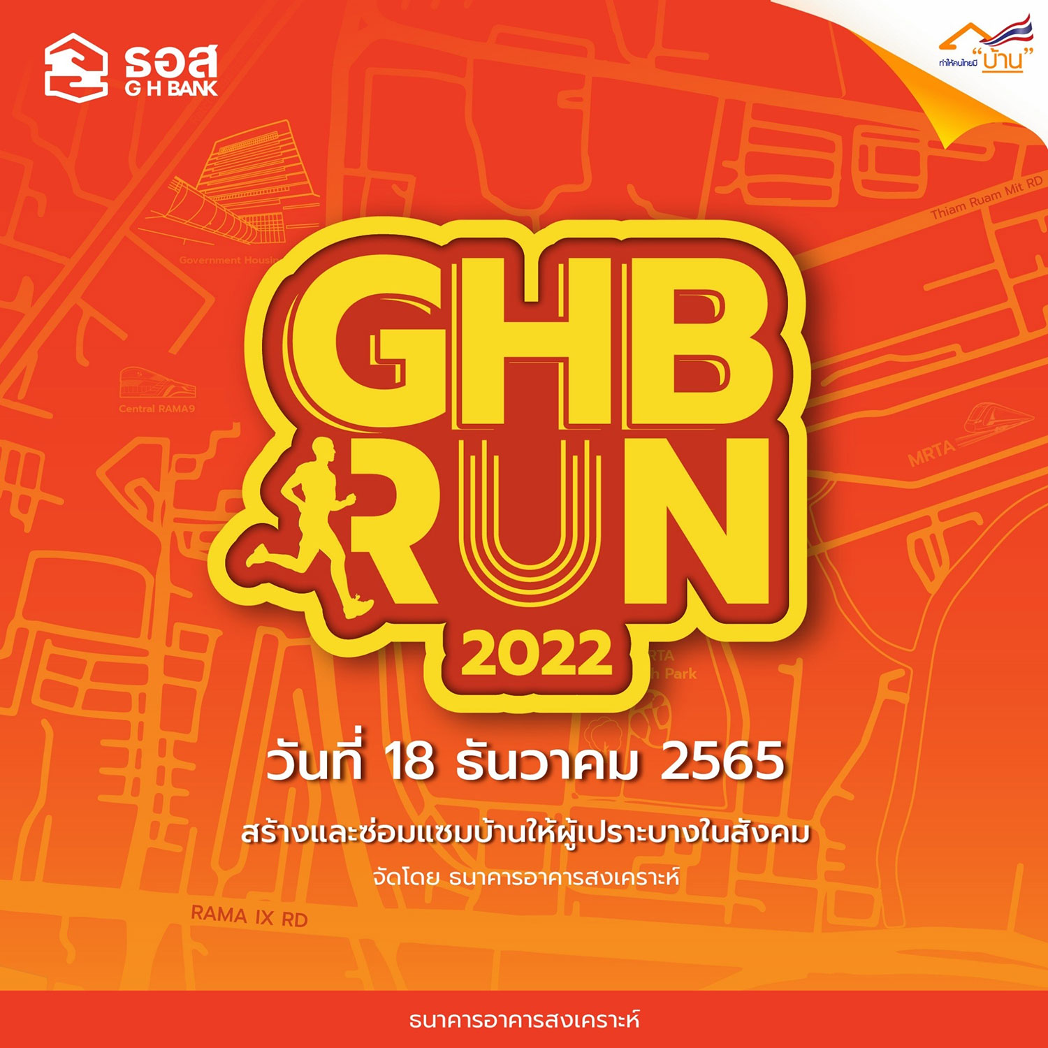 นายฉัตรชัย ศิริไล กรรมการผู้จัดการธนาคารอาคารสงเคราะห์ (ธอส.) เปิดเผยว่า เพื่อเป็นการส่งเสริมให้คนไทยหันมาออกกำลังกายเพื่อสุขภาพที่ดี พร้อมกับได้มีส่วนร่วมในการสร้างความมั่นคงทางด้านที่อยู่อาศัยให้กับกลุ่มผู้เปราะบางในสังคมไทย เพื่อคุณภาพชีวิตที่ดียิ่งขึ้น ธอส. สถาบันการเงินเฉพาะกิจของรัฐที่มีพันธกิจ “ทำให้คนไทยมีบ้าน” จึงได้จัดกิจกรรมเดิน-วิ่ง “GHB RUN 2022” ในวันอาทิตย์ที่ 18 ธันวาคม 2565 ชิงเงินรางวัลมูลค่ารวมสูงถึง 340,000 บาท นอกจากนี้ธนาคารจะนำรายได้จากค่าสมัครของผู้เข้าร่วมกิจกรรมทั้งหมดโดยไม่หักค่าใช้จ่ายรายละ 400 บาท ไปสร้างและซ่อมแซมที่อยู่อาศัยให้กับกลุ่มผู้เปราะบางในสังคม ได้อยู่อาศัยภายในบ้านที่มีคุณภาพและสภาพแวดล้อมเหมาะสมกับการดำเนินชีวิตมากยิ่งขึ้น โดยแบ่งระยะการวิ่งเป็น 2 ประเภท คือ ประเภท Fun run ระยะ 5 กิโลเมตร และ Mini marathon ระยะ 10 กิโลเมตร ขณะที่การแข่งขันและเงินรางวัลประเภท Mini Marathon แบ่งออกเป็น 2 ประเภทรางวัล ประกอบด้วย
