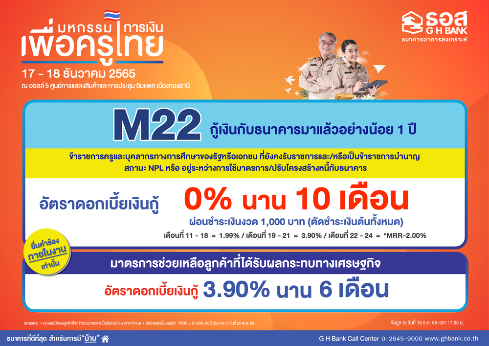 มาตรการช่วยเหลือลูกค้าปัจจุบันของธนาคาร 1.มาตรการ 22 [M22] : สำหรับลูกค้าข้าราชการครูและบุคลากรทางการศึกษาของรัฐหรือเอกชน ที่ยังคงรับราชการและ/หรือเป็นข้าราชการบำนาญ สถานะ NPL หรือ ลูกค้าข้าราชการครูและบุคลากรทางการศึกษาของรัฐหรือเอกชน ที่ยังคงรับราชการและ/หรือเป็นข้าราชการบำนาญ สถานะ NPL ที่อยู่ระหว่างการใช้มาตรการ/ปรับโครงสร้างหนี้ที่กู้เงินกับธนาคารมาแล้วไม่น้อยกว่า 1 ปี ให้ผ่อนเงินงวดต่ำพร้อมลดอัตราดอกเบี้ยเงินกู้พิเศษ 2 ปี เดือนที่ 1-10 ชำระเพียงงวดละ 1,000 บาท อัตราดอกเบี้ย 0% ต่อปี (ตัดชำระเงินต้นทั้งหมด) และ 2.มาตรการช่วยเหลือลูกค้าที่ได้รับผลกระทบทางเศรษฐกิจ : คิดเงินงวดจากอัตราดอกเบี้ย 3.90% ต่อปี นาน 6 เดือน